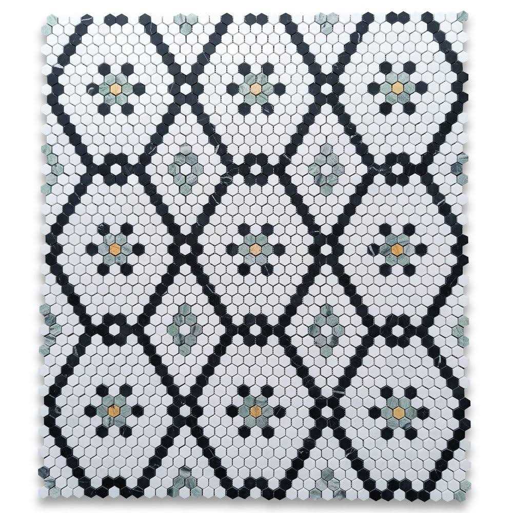 Marble Online Hexagon Snowflake Thassos White Marble Mosaic Tile Black Green Gold