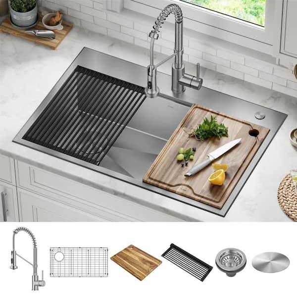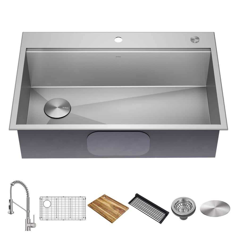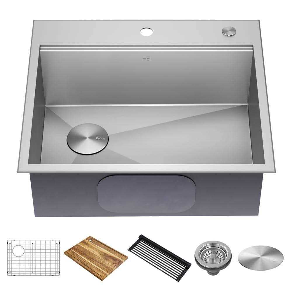 KRAUS Loften Drop-in/Undermount Single Bowl Stainless Steel Kitchen Workstation Sink with Accessories