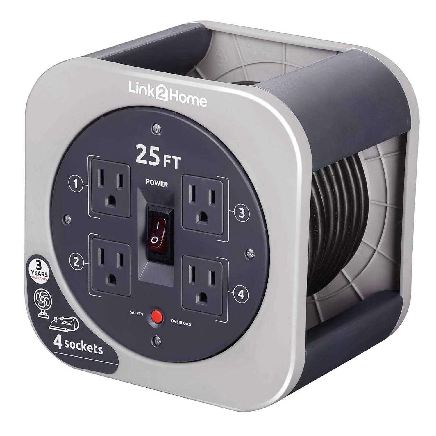 Link2Home Cord Reel 25 ft Extension Cord 3 Power Outlets