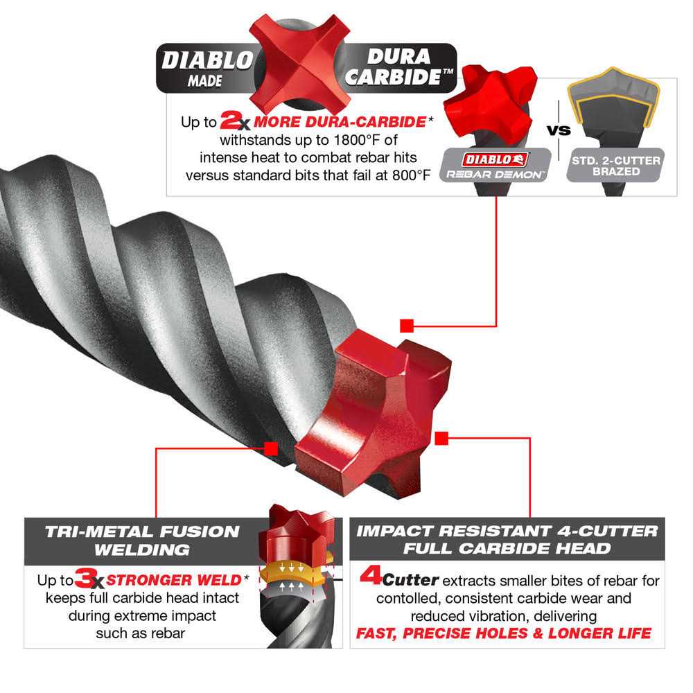 Diablo DMAPL4250 Rebar Demon SDS-Plus 4-Cutter Full Carbide Head Hammer Bit