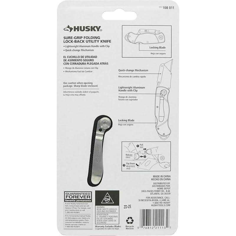 Husky 21113 Folding Sure-Grip Lock Back Utility Knife w/ 10 Disposable Blades Included