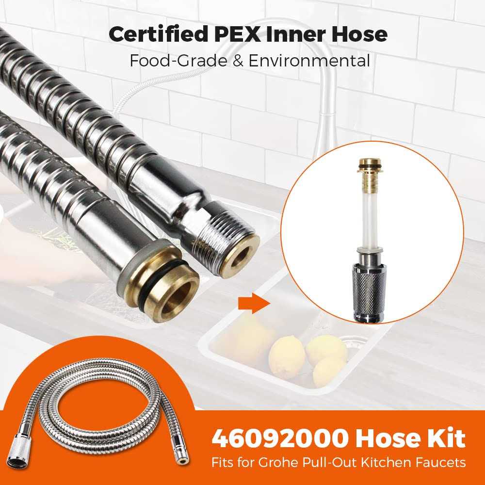 Compatibility: Our 46092000 pull out faucet replacement hose is compatible with Grohe kitchen faucets, fits for Alira, Ashford, Eurodisc, Eurodisc 99, Europlus, Ladylux, Ladylux Diy, Touch & Touch single-handle kitchen faucets and other models. Material: With highest quality PEX inner hose, this kitchen spray hose for Grohe kitchen faucets is safe to drink water. Nice hose for kitchen faucets. Quality: This pull down replacement hose is made of the highest quality of metal and PEX inner hose. Solid brass end fittings connection ensure quality durability. Strong 304 stainless steel construction ensures the long time daily usage. Easy to Install: This sink replacement hose is easy to install. Stainless metal makes the replacement faucet hose straight and won’t twist. Solve your kitchen faucet leaking problem. Package and Service: Each bag contains 1*46092000 hose kit. When you have any problem or assistance needed, do ot hesitate to c