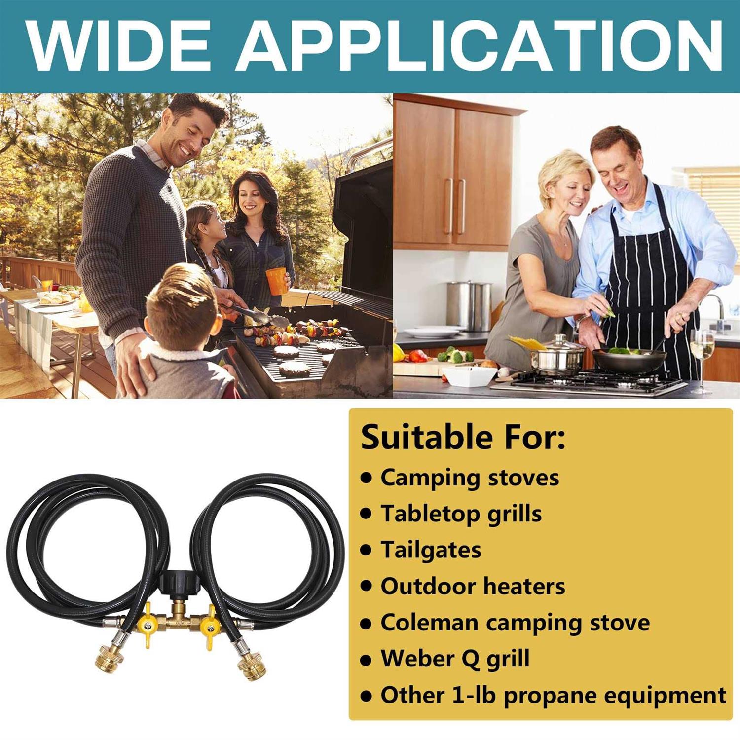 WIDELY APPLICATION: The propane 2 way Y splitter hose is compatible with all equipment with QCC1/Type 1 connection and 1 lb to 20 lb propane tank, suitable for camping stoves, tabletop grills, tailgates, outdoor heaters, coleman camping stove, weber Q grill and more 1-lb portable propane equipment. EASY & CONVENIENT: This propane two way splitter hose is a perfect replacement for the 16.4oz/1 pound green small tank, and it can be directly connected to a 1-pound portable propane device without an additional regulator. UPGRADED DESIGN: The 2 way design allows you to connect two appliance easily at the same time to the propane tank by hand without any tools. Equipped with a control valve on each way of the hose, convenient to control the flow. SUPERIOR QUALITY: Both adapters are made of solid brass, and the hose is made of high quality rubber, which allows a long-lasting life of the product. 350PSI rated propane tank outlet pressure, and the over flow&heating protection design can ensure safety. The extension hose can be installed to a 5-40lbs propane tank easily by hand. br 2. The 2 way design allows you to connect two appliance to the propane tank at the same time, NO NEED for two hoses, two adapters, even a 2 way y splitter adapter. So, it can save your cost, as well as avoid gas leakage problem. br 3. The 2 way Y splitter CGA propane tank hose is equipment with control needle valve. You can close one of the grill and changing the gas flow easily. br 4. Easy installation, no tools required during use. Just connect the QCC adapter to the propane gas tank, and the other two adapter to the 1lb regulator on your grill. br br Working instructions: /b br 1. The propane hose is designed with over flow protection. If the connection loose, the gas will be shut off. br 2. Please make sure the grill connects well before openning the gas, or the safety device will work and stop the gas from comming into the grill. br 3. The propane hose connection adpater can only be used for 1lb regulator, it cannot connect a low pressure regulator with QCC or P.O.L inlet fitting. br 4. The needle valve makes it easy for you to control the gas flow. If you want to stop one of the grill, just close the needle valve. If you don’t use it for a long time, close the cylinder valve as well. br