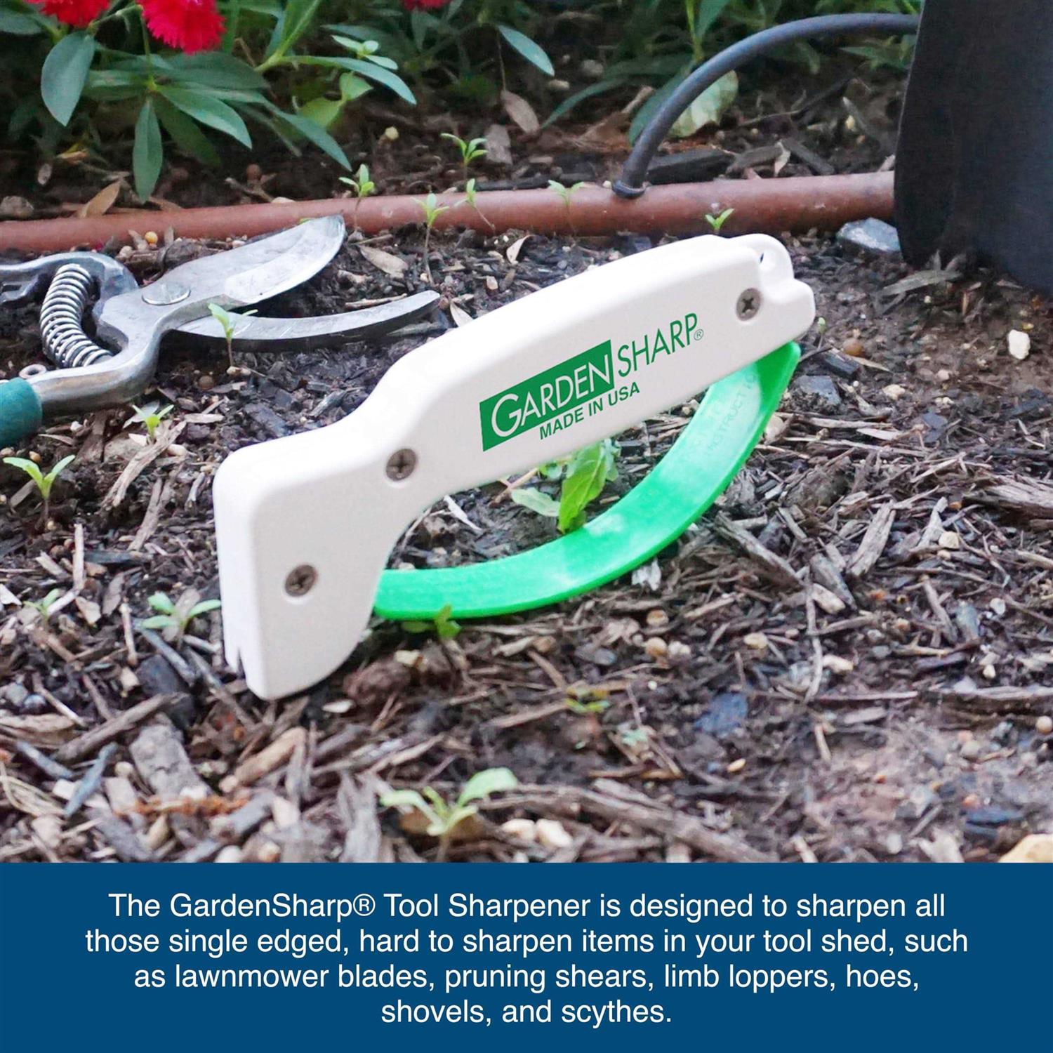 The GardenSharp tool sharpener is designed to sharpen all those single edged, hard to sharpen items in your tool shed, such as lawnmower blades, pruning shears, limb loppers, hoes, shovels, and scythes. All can be sharpened to a razor edge quickly and easily. The full length finger guard protects fingers while the reversible diamond honed tungsten carbide blade puts your cutting edge in “good as new” condition.