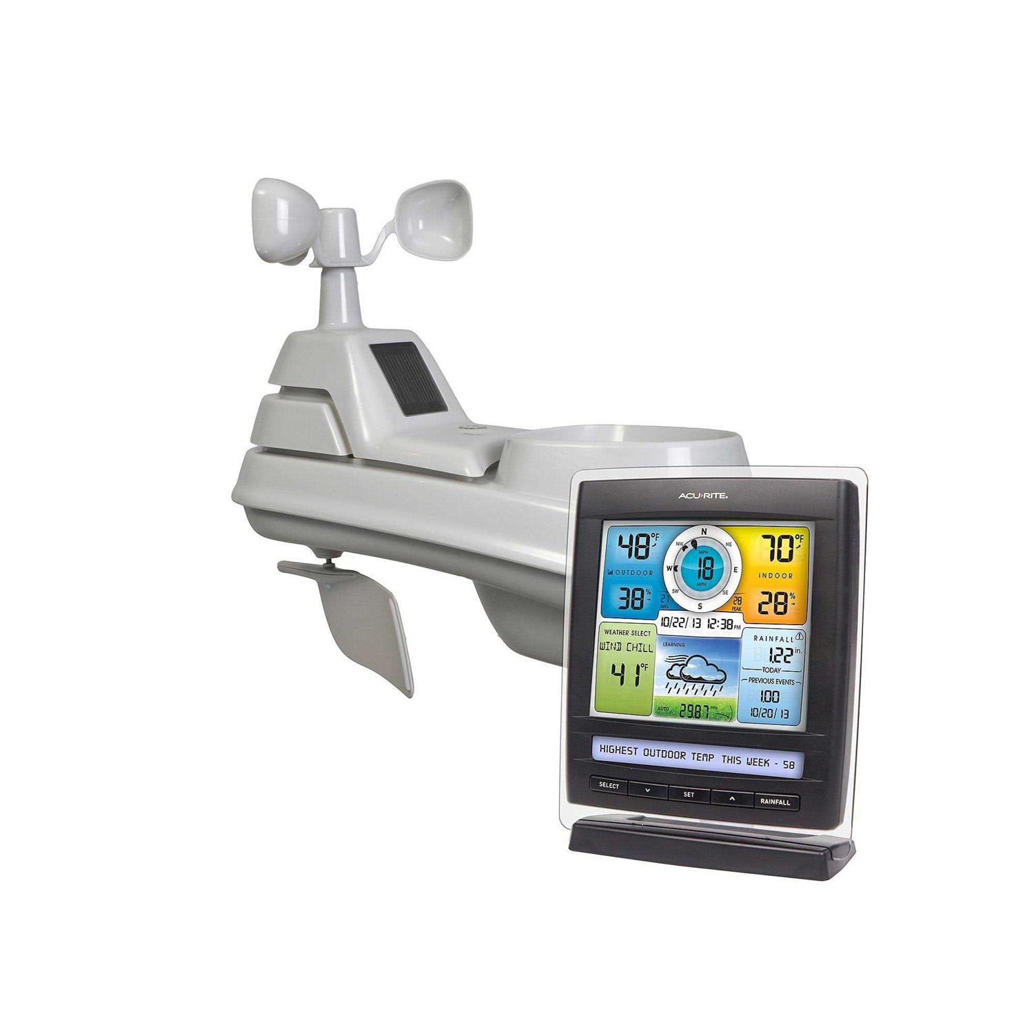 Get the weather forecast and temperature information to plan your day with confidence with AcuRite’s Pro Color Weather Station. The weather station’s illuminated color display features indoor and outdoor temperature and humidity, rainfall, wind speed/direction/chill, the weather forecast, heat index, dew point, wind chill, wind direction gauge, barometric pressure with 12-hour history, time, and date. Display stands upright for tabletop use or is wall-mountable. The AcuRite Professional Weather Station uses patented Self-Calibrating Technology to provide your personal forecast of 12 to 24-hour weather conditions. Self-Calibrating Forecasting is generated from weather data measured by the 5-in-1 sensor in your yard – giving you the most accurate forecast available for your exact location. The patent-pending 5-in-1 sensor is easy to set up, includes mounting hardware, and features a 2-year battery life for maintenance-free operation. It’s more than accurate, it’s AcuRite.
