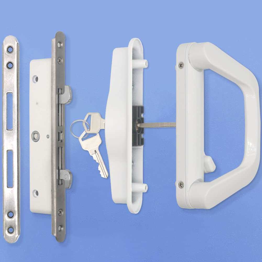 Sliding Patio Door Handle Set with Mortise Lock (Keyed) Features: Adjustable Lock Latch: Modified latch can be cut according to your door thickness. Can be adjusted for use on different sized doors. Reversible Handle Design: No matter your sliding glass door is left or right open, this handle can be installed perfectly. Keyed Pull Handle: Pull Handle has a key cylinder in it. You can lock by key from your outside yard to give you a mind peace safty home. Easy to Install: Step 1: Remove 2 screws from Interior handle. Step 2: Insert Latch, align inside and outside handles with Pre-drilled door holes, insert screws and tighten. Step 3: Install the locking plate and your done. Specifications: Color: White Material: Zinc and Aluminium Alloy with Die-Cast Handed Construction: Non-Handed(Reversible), Keyed Suitable for door thickness from 0.9in to 1.4in. The center hole distance of the handle: 12.4cm/4.9in. How to install and use: Please look at the pictures or videos carefully for the detailed process !!! Package Included: 1 x Interior Handle 1 x Exterior Pull 1 x Mortise Lock 1 x Copper Lock Core 1 x Door Keeper(Lock Plate) 2 x Copper Keys 2 x 1.57in Long Iron Screws 6 x 0.75in Short Iron Screws