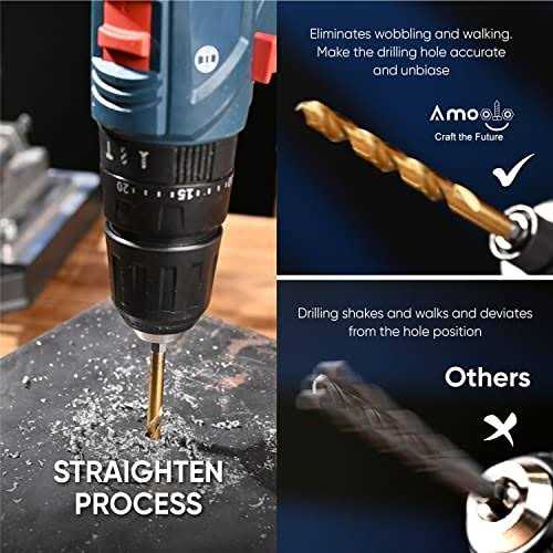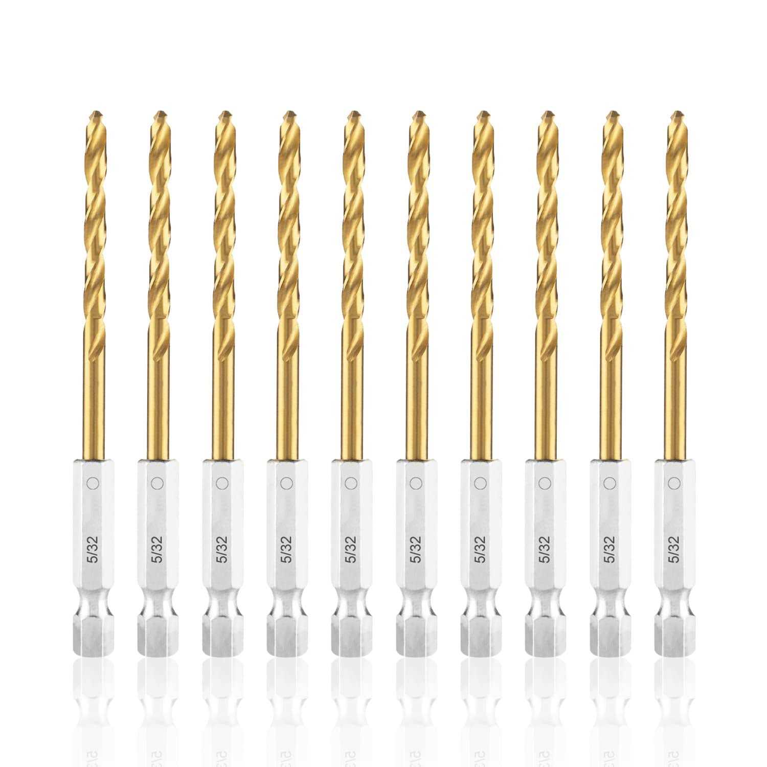 【10Pcs 5/32″ HEX DRILL BITS】10Pcs – Diameter:1-11/16”(43mm) x Flute Length:1-11/16”(43mm) Metal Drill Bits. Come with a portable plastic case for easy select, storage and carry; 【ADVANCED HSS TITANIUM COATING】Industrial grade 4341 high speed steel drill bits set, harder than 4241 HSS and has stronger cutting capacity. Titanium coating increases wear-resistance and durability; 【FULLY GROUND PROCESS & 135° SPLIT POINT】Fully ground spiral flute discharge scraps quickly, reduce friction and heat, therefore provides a faster, cooler and more efficient drilling performance; 135° Split Point with straight shank prevents slippage and makes drilling stable and precise. No center punch is needed; 【QUICK CHANGE】5/32″(4.0mm) hex shank base well fits into majority pistol drill and drill press, more easily and securely installation without slippage and shedding; 【MULTIPLE APPLICATION】Small Drill bits for wood, plastic, steel plate ≤ 5mm, aluminum alloy and other soft metals. Ideal choice for DIY projects, household maintenance and repair NOT for glass, ceramic or concrete drilling. amoolo 5/32 Impact Drill Bits Set, 10Pcs Titanium HSS Twist Hex Shank Drill Bit Set for Metal, Steel, Wood, Plastic, Quick Change Design