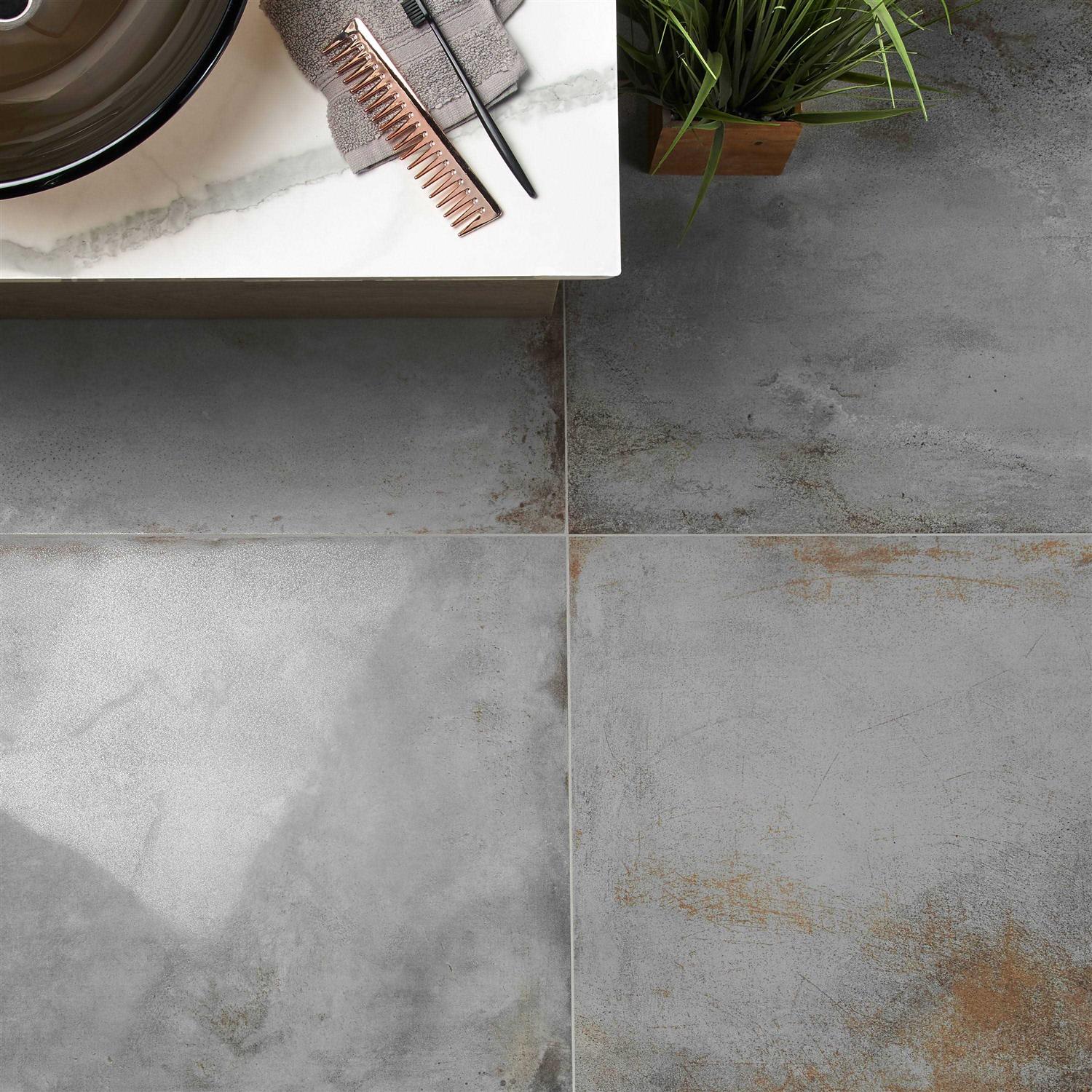 The industrial nature of sheet metal finds a refined eloquence in the Angela Harris Fuller collection. This fully realized porcelain series captures the essence of aged metal with a patina that fades at the edges to a shimmer, articulating its shape and catching the eye in the light. A modern color palette supports an elevated industrial-inspired visual as a subtle gloss effect on the finish enhances the metallic quality of the tile. Offered in a full suite of sizes and formats, this exclusively designed collection is suitable for floor and wall installation, bringing its cutting-edge look to kitchens, bathrooms, living rooms, and beyond.