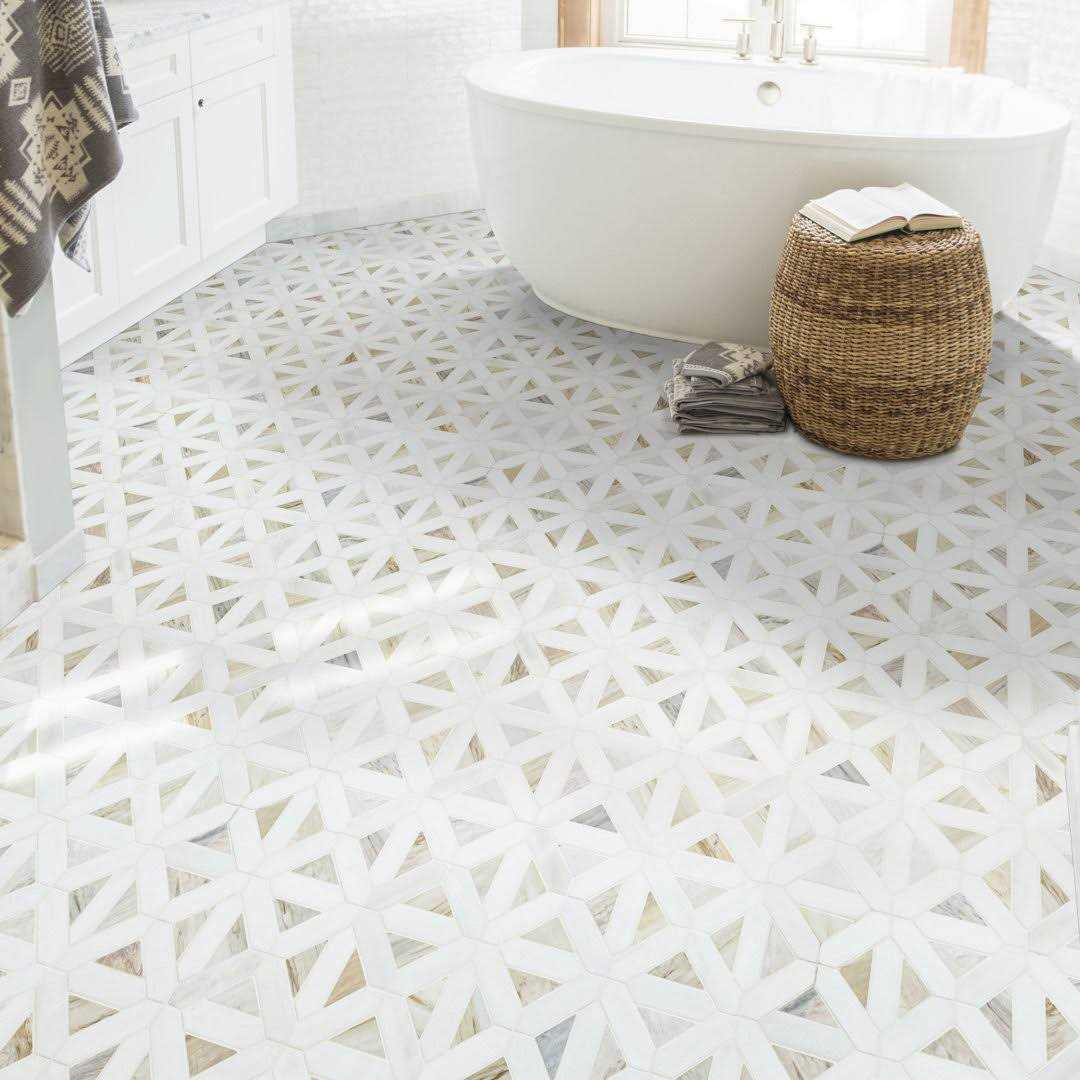 MSI’s Angora Geometric Polished Marble Mosaic Tile is classic marble with a modern edge featuring distinctive, warm beiges and gold tones accented by cool gray and white tones. It’s ideal for creating beautiful kitchen backsplash, shower surrounds, accent walls, and other design features throughout homes and light-use commercial properties. The timeless shape and color of this patterned marble mosaic make it exceedingly versatile — complementing traditional to contemporary design styles. Pair it with a marble tile or mosaics for a style-savvy cohesive look, or use it alone to add a touch of unexpected detail and interest to any space. Tiles are prearranged on 12×12 mesh-backed sheets for simplified installation and coordinating moldings give your project a professional look.