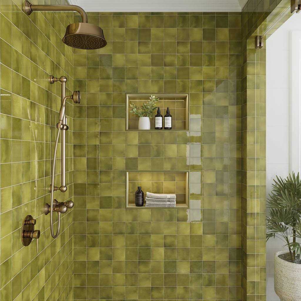 The beauty of this textured ceramic tile lies in its authentic surface detailing – it injects a layer of organic aesthetic to any design setting. The handcrafted appeal gives it a distinct, natural feeling to take your backsplash designs to a whole new level! Install it for a kitchen backsplash with a pop of green to make a subtle statement, or lay it around the vanity area paired with gold fixtures to make a strong statement in the bathroom! This ceramic tile can be dressed up or down – let it envelop your room or use it in smaller doses using it as an accent tile. This textured square tile allows us to turn away from homogenous surfaces and upgrade from flat painted walls. Create backsplashes and accent walls full of nuance and visual depth! If you’re ready to achieve visual impact in your space, this green tile can create a gorgeous textured wall design that makes an unforgettable statement!