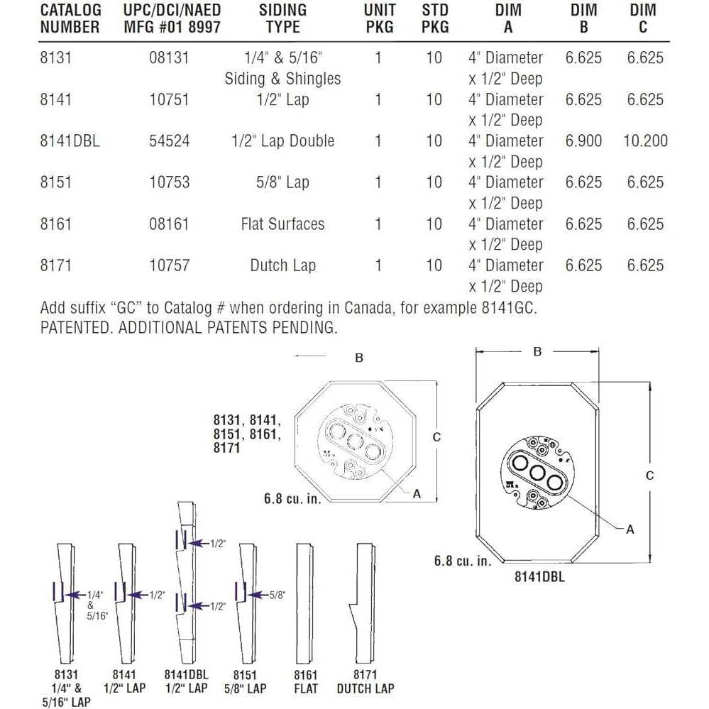 The Arlington 8141-1 Siding Mount Block Kit with Built-in Box is a high-quality cabinet hardware product that allows for smooth vertical mounting of light fixtures. This kit includes a mounting block with a built-in electrical box, a non-metallic cable connector, and 4 screws for easy installation. The electrical box has a diameter of 4 inches and is UL listed for safety. With its durable construction and convenient features, this kit is perfect for securely mounting light fixtures on siding.