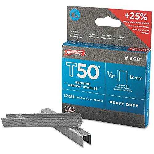 Durable, heavy-duty staples hold tight. Premium-quality carbon steel staples are designed for arrow staplers. Extra-sharp chisel points penetrate easily. Flat crown lies smooth. Staple type: heavy-duty; for use with Arrow T50 OC stapler; leg length: 1/2 inches.