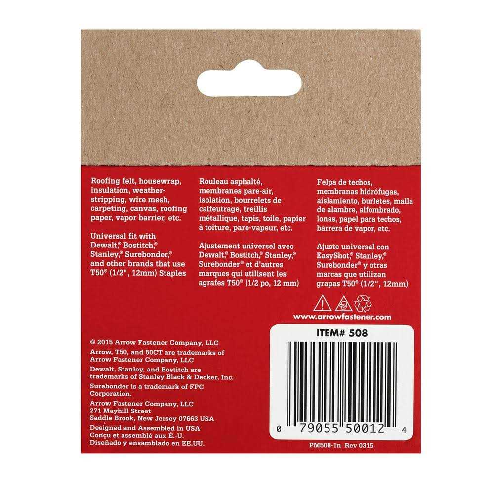 T50 staples are the world’s best-selling heavy-duty staple platform. Made to deliver exceptional holding power, these staples are used for all heavy-duty stapling applications- from installing insulation, housewraps, and roofing underlayments to upholstering fine furniture and window treatments. A true workhorse of a fastener, Arrow T50 staples are made to precise specifications on state-of-the-art equipment. HT-50A, T50, and T55. This size staple is best used for paper, light fabric and thin plastic. 5/16″ / 8mm. This size staple is best used for fabric, plastic and cardboard. 3/8″ / 10mm. This size staple is best used for plastics, house wrap, window screens and roofing paper. 1/2″ / 12mm. This size staple is best used for soft wood, insulation, carpet padding, house wrap and roofing paper.