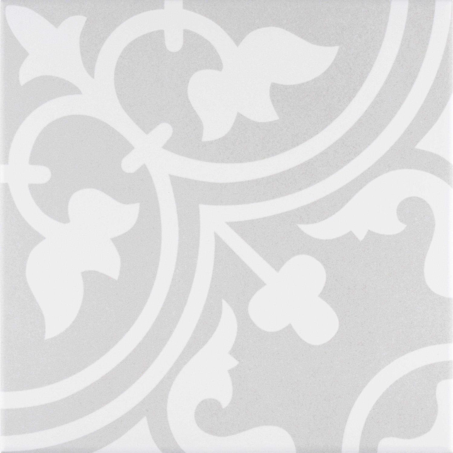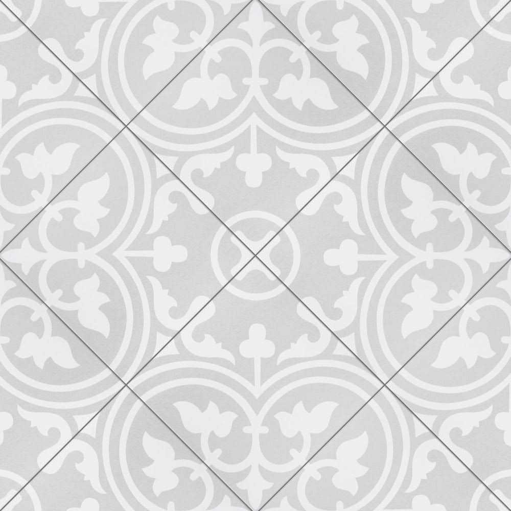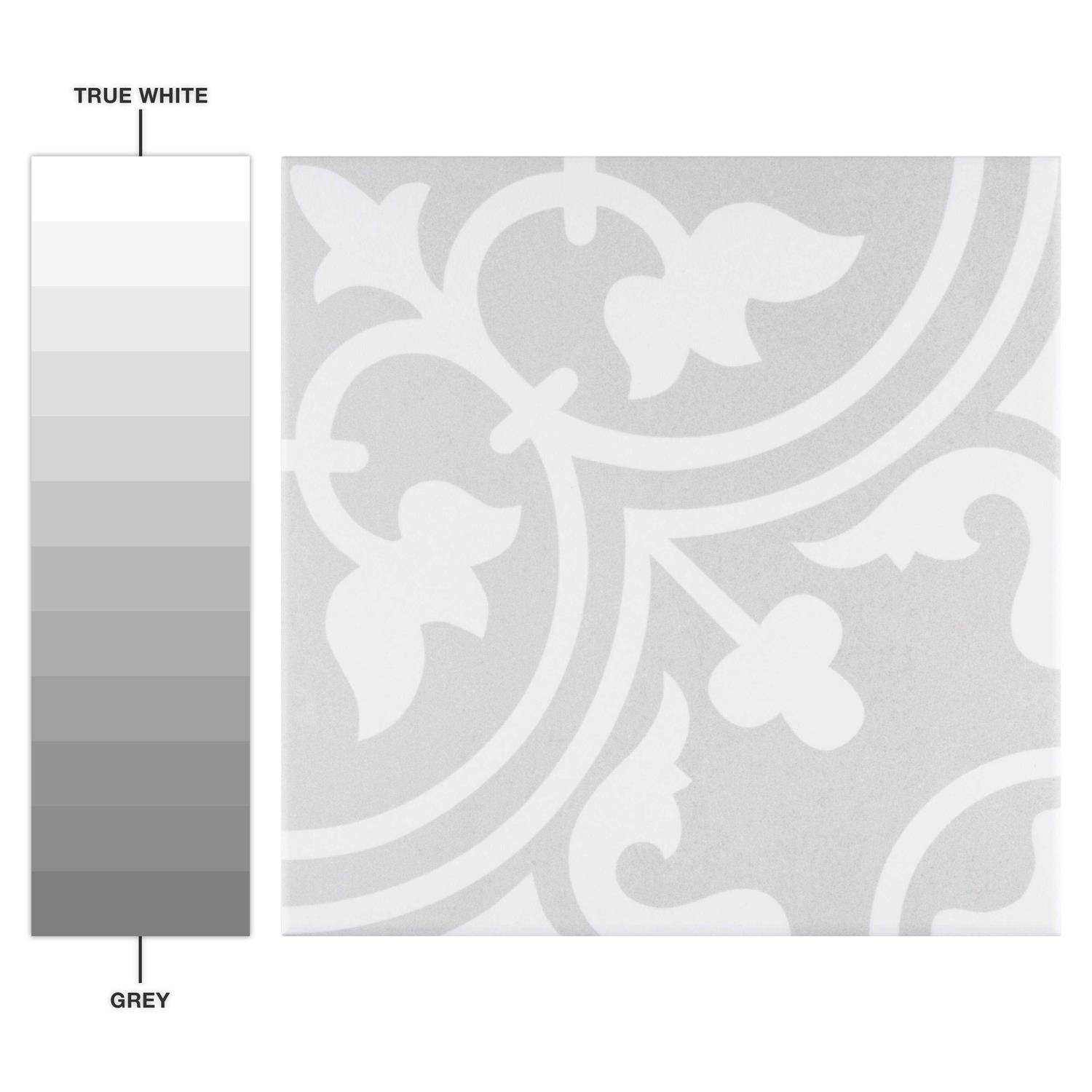 As the original encaustic-look porcelain tile that started the patterned tile trend, our Arte Soft Grey Porcelain Floor and Wall Tile draws inspiration from artisan cement tiles. Crafted in Spain, this porcelain tile features a large floral old-world pattern in off-white that frames dueling arcs in the center, offering subtle contrast and dimension to the decoration. Set on the highest-quality light grey base glaze, the contrasting design features a weathered, speckled look, replicating the beauty of its cement muse. The floral, geometric pattern blends into virtually any design theme, making this an exceptional product for modern installations and historic renovations. Its impervious, frost resistant, and durable features make it an ideal choice for both commercial and residential indoor and outdoor installations including, kitchens, bathrooms, backsplashes, showers, hallways, entryways, patios, and fireplace facades.