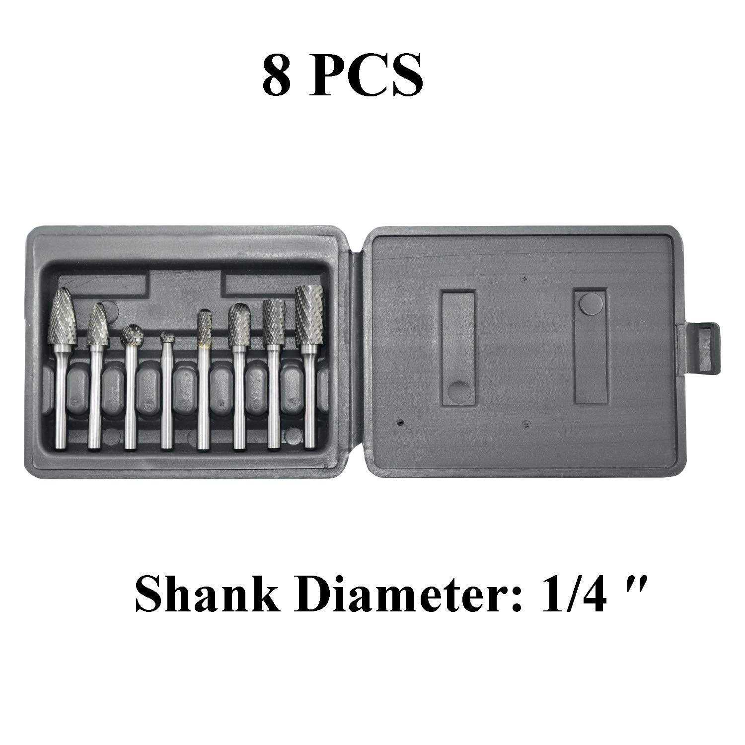 Asieg Tool Carbide Burr Set 8pcs with 1/4”Shank Double Cut Solid Power Tools Tungsten Carbide Rotary Files Bits for Die Grinder Metal Wood Carving Engraving