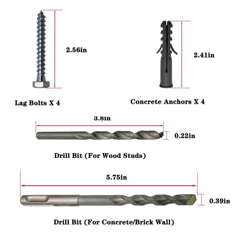 - Package: The kit includes 4 lag screws, 4 concrete anchors, 4 washers,2 kinds of drill bits