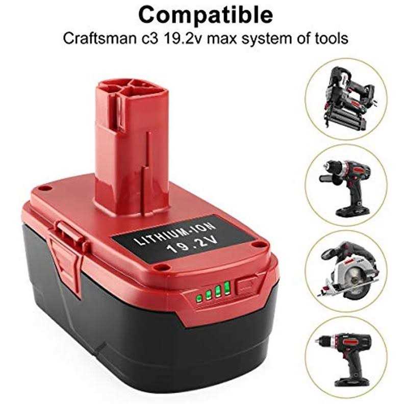 Craftsman Battery Specification:Product Type:Lithium-ion BatteryVoltage: 19.2VCapacity: 5000mAhBattery Type: Li-IonReplace Battery P/N:for Craftsman C3 19.2-Volt Battery11375, 11376, 130211004, 130279005, 11045, 120235021, 1323903, 130279003, 315.115410, 315.11485, 315. PP2010, PP2011, 315. PP2011, 315. PP2025, PP2030Compatible Tools Model:for Craftsman C3 19.2-Volt Cordless Drill Power Tool10126, 11541, 11543, 11570, 11576, 11578, 11580, 11586, 17338, 17339, CRS1000, 315.114852Craftsman Charger Specification:Product Type: Lithium-ion/NiCd/NiMh Battery ChargerInput: 100V-240VOutput: 2A