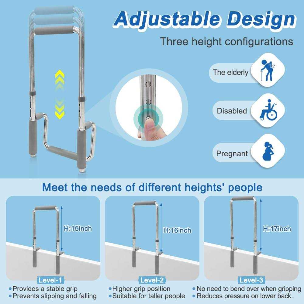 【Bathtub Safety Rail】The tub grab bar provides necessary bath support for getting into and out the bathtub, ensuring the safety when bath or shower for the elderly, pregnant, handicap and disabled. Tub transfer bar can hold up to 250lb, preventing falls and injuries. 【Height Adjustable】The height of bathtub handle can be adjusted from 15 to 17 inch, you can flexibly adjust it by your needs. Appropriate bathtub railing height make it easy for people to grip,reduce back pain caused by bending down during bathing. 【Clamp on Tub Rail】Bathtub grab bar designed with a large clamp area, can be firmly fixed on the bathtub without fear of slipping out. No drilling required and no damage to your tub. The clamp has a width adjustment range of 2.5-4.5 inch and fits most standard tubs. [Not for fiberglass tub] 【Stable Grab Bar】The bottom of tub transfer bar is covered with anti-slip PE pad and black foam pad, which increases friction with the bathtub wall. It can be stably clamped on the side of bathtub without scratching the bathtub. 【Strong & Durable】Clamp on grab bar is made of heavy duty stainless steel, surface is covered with a waterproof coating,resistant to corrosion and wear. Handle is covered with a layer of soft sponge, which enhances comfort and prevent slippingeasy to grip, improving safety performance. Safety Warning: 1. Please install it firmly before using to prevent accidents; 2. Please check the stability regularly. If it is loose, please tighten the screws in time; 3. Not suitable for curved bathtubs; 4. br NEAUDE bathtub handles is a functional grab bar that can help the elderly, disabled, pregnant women easily get in and out of bathtub. br Provide support when stand up and sit down from bathtub, prevent slipping and falling injuries during bathing. br br strong Why Choose NEAUDE? /strong br br 【Adjustable Bathtub Rail】 br The height of bathtub handle can be adjusted from 15 to 17 inch, you can flexibly adjust it by your needs. br Suitable for the elderly with different heights and body types. br Bathtub grab bar designed with a large clamp area, can be firmly fixed on the bathtub without fear of slipping out. br The clamp has a width adjustment range of 2.5-4.5 inch and fits most standard tubs. br br 【Anti Slip & Stability】 br The bottom of the transfer bar is covered with a transparent anti-slip PE pad and black foam pad, can be more stable and fixed on the bathtub side wall without damaging the bathtub. br (Note: There are slight bubbles on the PE pad of tub grab bar, which is normal.) br The handrail part of clamp on grab bar is covered with a soft foam, ensuring that the elderly can safely grasp and stand in a humid environment to avoid falling. br br 【High Quality】 br The tub transfer bar is made of stainless steel,which is corrosion-resistant and wear-resistant. br Bathtub railing surface is covered with a waterproof coating,not easy to rust. br Bathtub grab bar supports up to 250lb, which can provide stable support for the elderly to get into and out of bathtub.