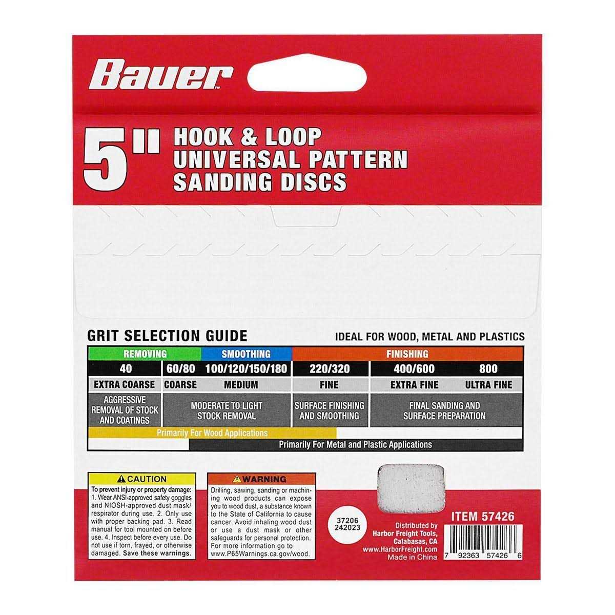 These BAUER universal pattern sanding discs are designed for use on 5-hole or 8-hole disc sanders. Constructed with a high-performance hook and loop backing, these sturdy discs are easy to remove and replace. Premium zirconia grain can be used on wood, metal or plastic. These long-lasting discs use anti-clog technology for longer life.