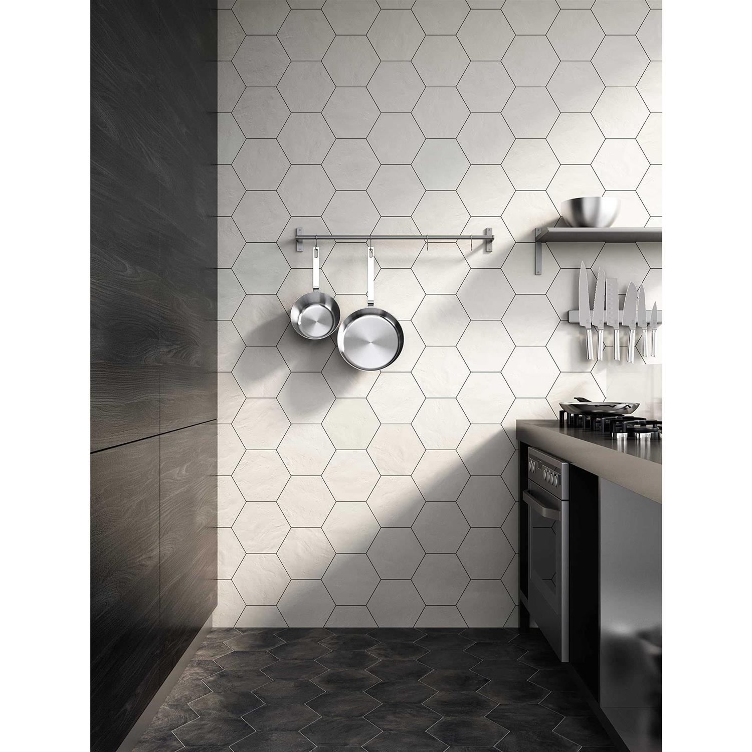 Add geometry to your floors and walls with Allora, an Italian-made matte porcelain tile that comes in three shapes: Rectangle (3”x24”), Rhombus (7.5″x12.75″) and Hexagon (8.5”x10”). The neutral colors of White, Gray and Black blend well with any room style. The hexagon shapes also come in three deco options in Fiore (floral pattern), Stella (star pattern) and Telaio (hexagon pattern). Create a solid-colored look, a complete patterned design, or combine the solids and decos for your own look.