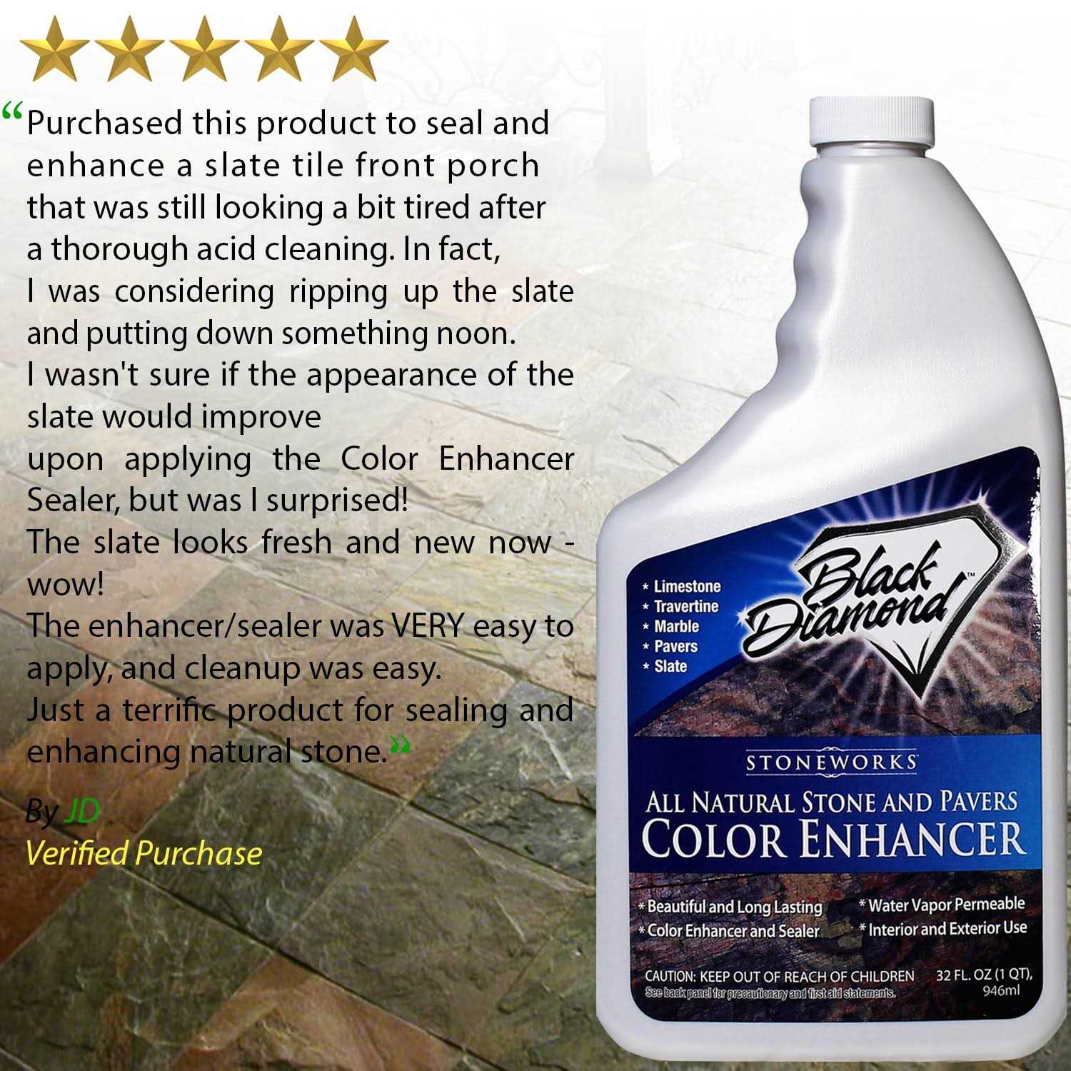 Black Diamond Stoneworks Color Enhancer Sealer for All-Natural Stone and Pavers. Marble, Travertine, Limestone, Granite, Slate, Concrete, Grout, Brick