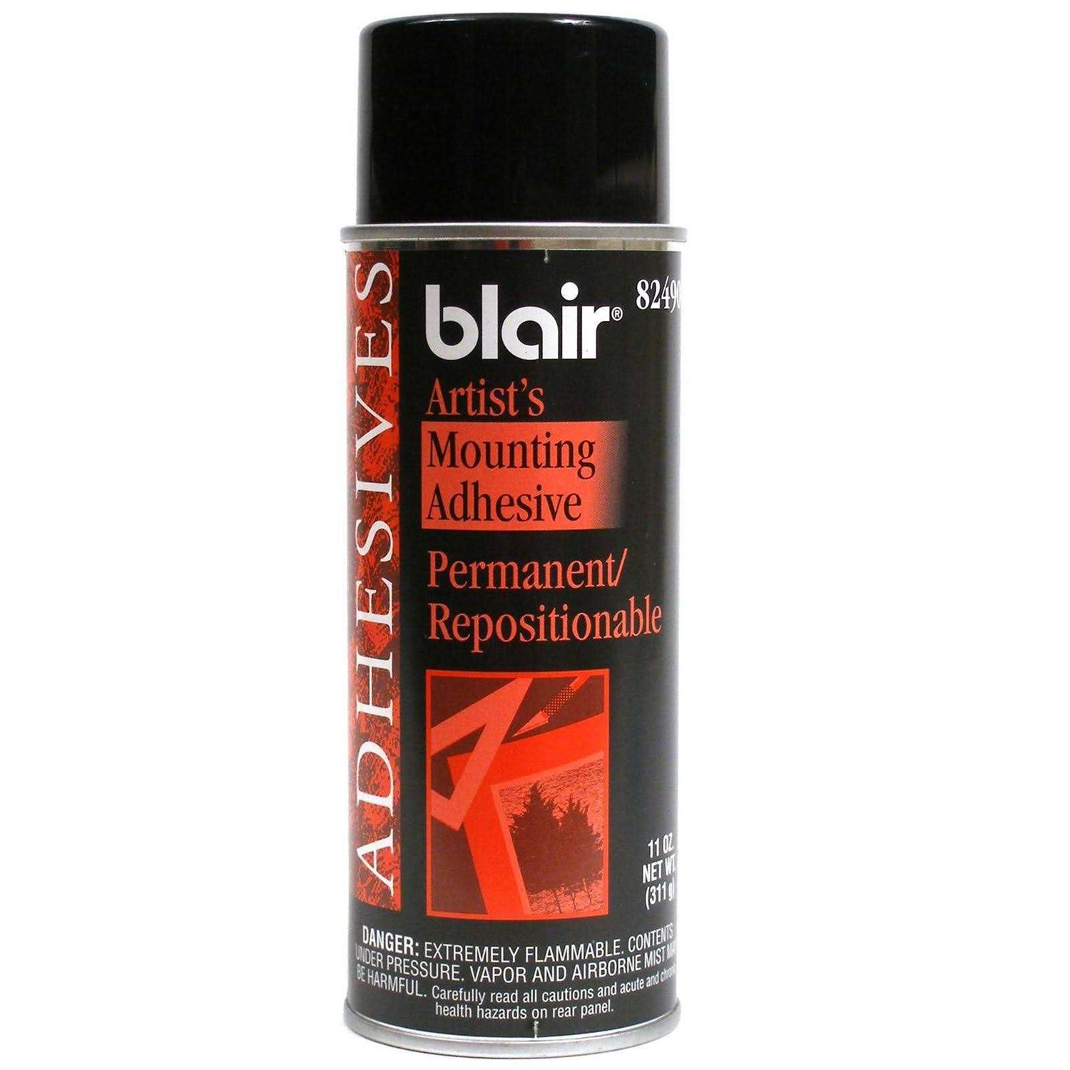 Blair-Artist’s Mounting Adhesive. This adhesive provides a strong bond on a variety of materials and will not bleed through, wrinkle or curl paper. Use on paper, cardboard, matte board, wood, glass, foil, plastics, mylar, acetate, leather and photography paper. This package contains one 330ml spray can of mounting adhesive. WARNING: Extremely Flammable- contents under pressure. Conforms to ASTM D 4236. Made in USA.