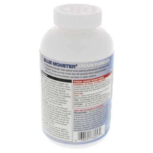 Devours hair, grease, soap and oils that slow and plug drain lines in less than 60 seconds! Blue Monster Drain Banger is a hot water activated drain cleaner designed to be used by professional contractors only. It is odorless and will not harm plumbing fixtures, porcelain or septic systems. Blue Monster Drain Banger is a hot water activated drain cleaner designed to be used by professional contractors only It is odorless and will not harm plumbing fixtures, porcelain or septic systems Grease, soap and oil build-up that will create future problems”