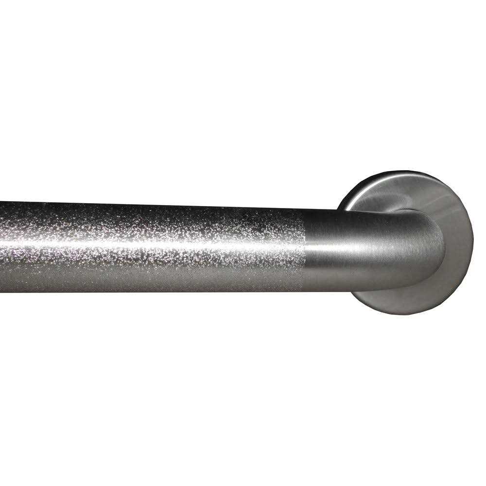 Satin finish with peened gripping surface. 24″ (610mm) long, 1-1/4″ (32mm) diameter tubing, peened finish. Constructed of 18 gauge (1.2mm), type 304 satin finish stainless steel tubing. Concealed mounting flange 1/8″ (3mm) thick, type 304 stainless steel plate, 2″ width by 3-1/8″ height (50 by 80mm), with screw holes for concealed anchors. Cover is 22 gauge (0.8mm), type 304 stainless steel with satin finish, 3-1/4″ (85mm) diameter. Cover snaps over mounting flange to conceal screws.
