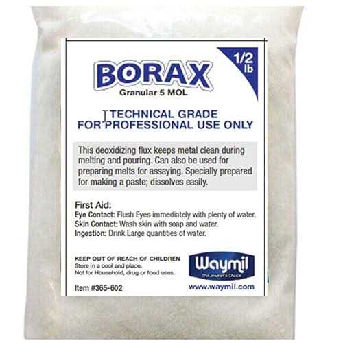 This deoxidizing flux keeps metal clean during melting (Gold, silver, etc) and pouring . Can also be used for preparing melts for assaying. Specially prepared for making a paste; dissolves easily. Borax is also used mixed with water as a flux when soldering jewelry metals such as gold or silver. Also used to glaze crucibles and casting process. You will need to glaze your crucible with borax before you melt any metal in it. This ensures that your metal doesn’t stick to the ceramic crucible. Net Weight 8 Oz (1/2 Lb) Borax (Sodium Tetraborate Penthydrate) TECHNICAL GRADE FOR PROFESSIONAL USE ONLY First Aid: Eye Contact: Flush Eyes immediately with plenty of water. Skin Contact: Wash skin with soap and water Ingestion: Drink Large quantities of water Keep Out Of Reach of Children Store in a cool and dry Place. Not for Household, drug or food uses.