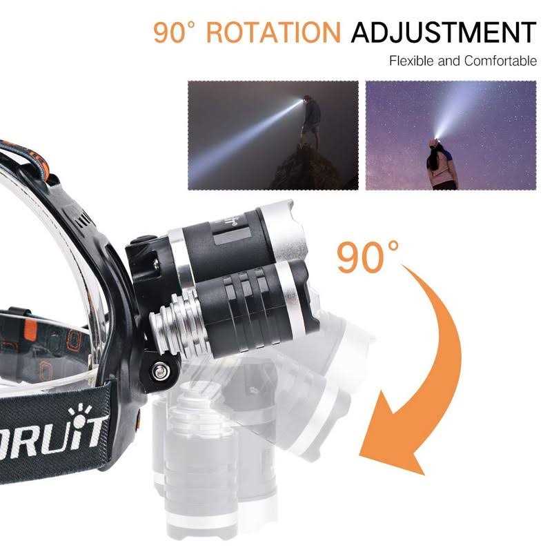 BORUIT Head Light Long-lasting Equipped charging the rechargeable headlamp conveniently.The head lamp with characteristic of high brightness, long lifespan, energy-saving. The maximum usage time is 10 hours after each charge. With a lifespan up to 100,000 hours. 4 Modes and Super Bright The Headlamps max output up to 5000 lumens without virtual mark, provide you with brightness for long-distance. 4 modes (high-middle-low-strobe) of the led headlight, you can choose the modes according to the surrounding environment. USB Rechargeable Construction Headlamp Micro USB input designed, it can be charged by laptop, power bank, car or USB charger via the supplied micro USB cord. The headlight is powered by 1 or 2x 18650 rechargeable batteries(2pcs included),a spare battery makes it more convenient when in outdoor activities. Waterproof, Durable and Adjustable Camping Gear It is rated to IPX5. Impervious to rainfall, avoid submerging it in water. Made of aluminum alloy with hard surface treatment. LED headlight can swivel it up and down 90 degrees.The lamp and headband can be separated, facilitating multi-function use. such as a bike light and camping light and portable light. This Camping Stuff Inclusion 3xT6 led Headlamp, USB cable, car charger, 4 helmet clips (The 4 free clips can be used to put the headlight on the helmet).