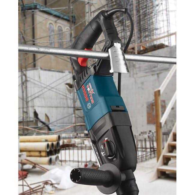 HammerHook allows quick tool storage during the job. 0-1,300 rpm; 0-5,800 bpm. Multi-function selector provides 3 modes of operation: rotation only, rotary hammer and hammer-only mode. Vario-Lock positioning rotates and locks chisel into 36 different positions to optimize working angle. Rotating brush plate provides equal power in forward and reverse. Cord Turret 35″ pivot for added flexibility and longer cord life. SDS-plus bit system tool-free bit changes with automatic bit locking, dust protection and maximum impact energy transfer rate. D-handle design is ideal for overhead and downward drilling applications. Variable speed reversing trigger for accurate bit starting as well as removing fasteners or bound bits. Integral clutch helps minimize torque reaction.