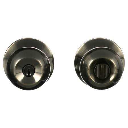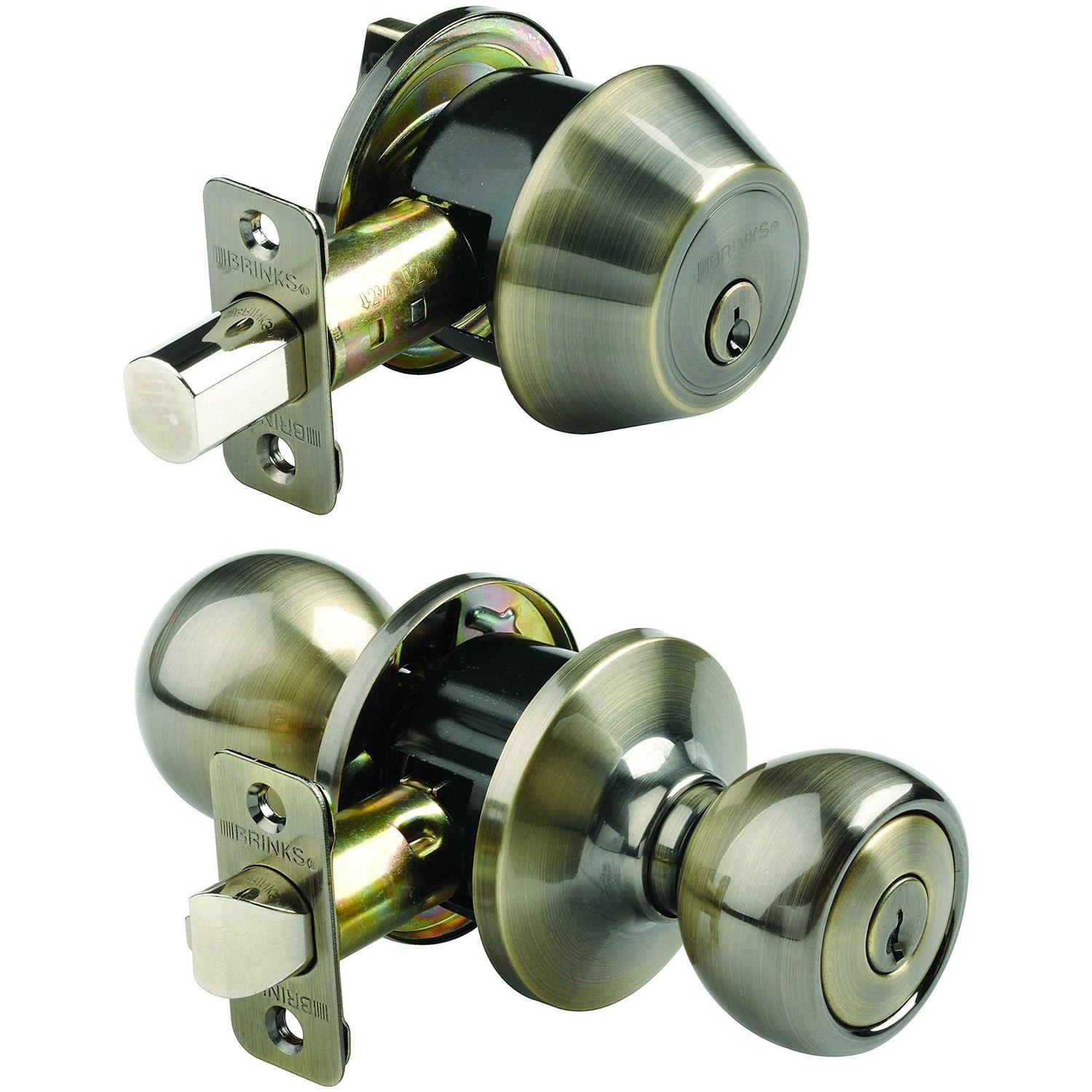 - Brinks durable, all metal construction Ball keyed entry door knob and single cylinder deadbolt combo in antique brass