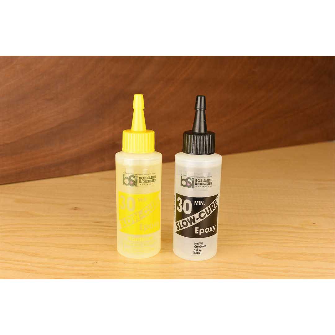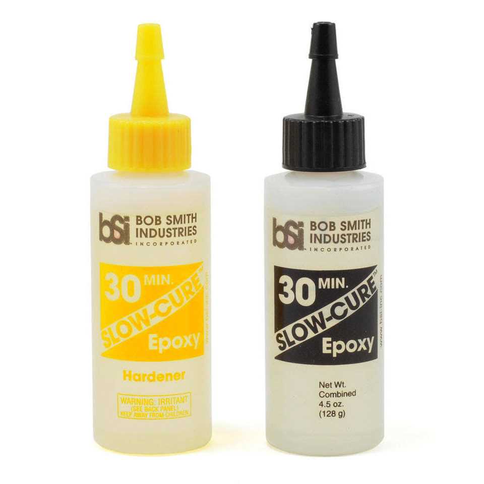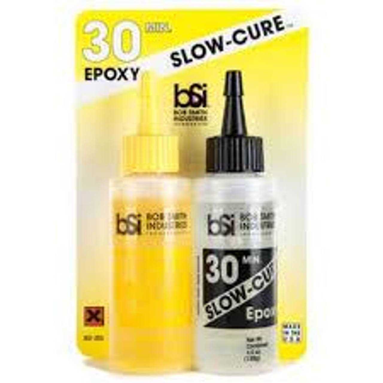 BSI Slow Cure 30 Minute Epoxy Glue BSI Slow Cure 30 Minute Epoxy Glue (128g) Bob Smith Industries Slow-Cure 30min. forms the strongest bonds, is waterproof and more heat resistant than any of the other epoxies in the range. Of course when using it for bonding the only problem is the length of time needed to cure; for handling there is a wait of 8 hours and full strength isn’t attained until the 24 hour mark is reached. To best take advantage of its strength use it to fillet already formed joints. It can be mixed with micro-balloons to form a putty-like consistency which is ideal for the task, although using this technique does slow down the curing time, by around 25%. Slow-Cure bonds best to clean, textured surfaces. Smooth, non-porous surfaces should be roughened with coarse sand paper to improve adhesion. Acetone and Isopropyl rubbing alcohol work as the best solvents for cleaning uncured epoxy from surfaces.