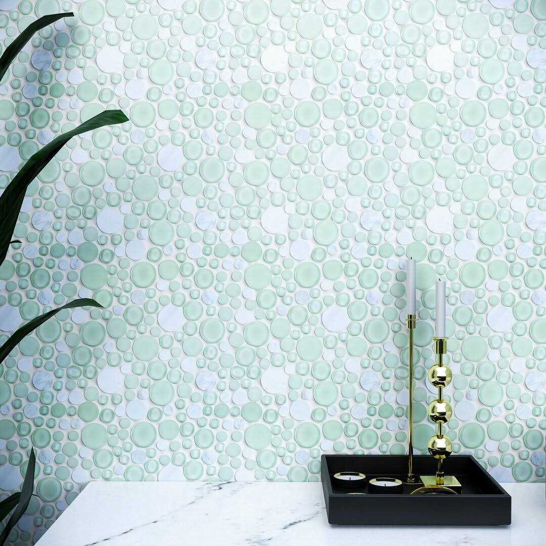 Supreme tile bubble art random marble look mosaic wall tile features a glossy patterned design. High-quality glass and marble transform your home into a magnificent space. The round creates beautiful layouts and designs when mixed and matched with other colors. It also features low maintenance and easy clean will make your life much easier. This premium tile is a perfect and elegant look for your living room, kitchen, and bathroom.