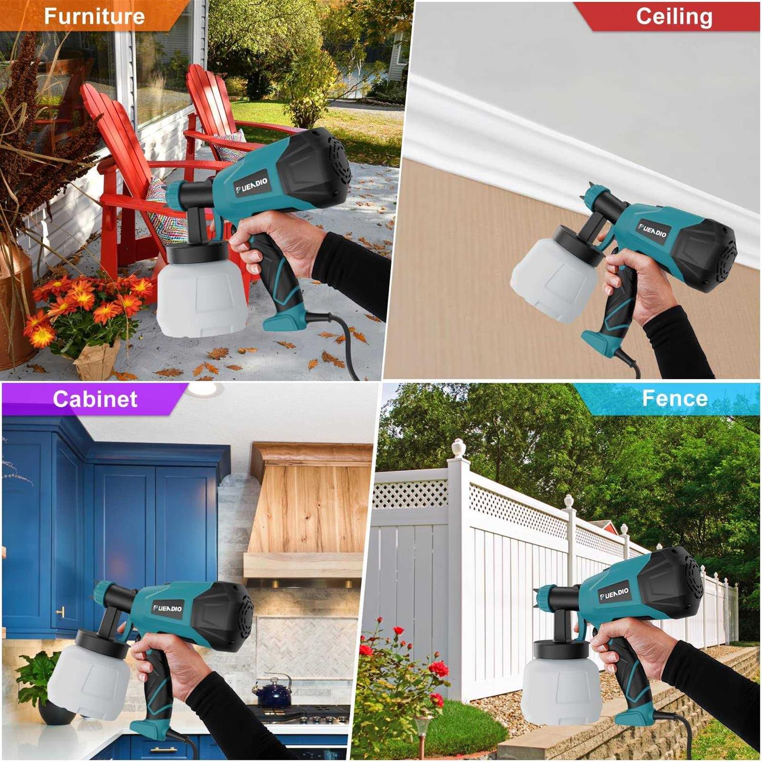 【6 Nozzle Sizes & 3 Spray Patterns】BUENDIO 700W paint sprayer can be adjusted to 3 different spray patterns: horizontal, vertical and circular, so that it can be applied to a wide range of application scenarios. Equipped with 6 sizes nozzles(1.2mm,1.5mm,1.8mm, 2.0mm, 2.5mm, 3.0mm) for various paint spraying projects, such as furniture, fences, interior walls, decks, garage doors, crafts etc. 【Upgraded Motor and Material】The motor uses a fuse with temperature protection. When a certain temperature is reached, the motor will automatically cut off the power supply to prolong the service life. Brass nozzles have superior performance than plastic nozzle, avoiding damage caused by falling or squeezing, not easy to be clogged, and easy to clean. Double-layer insulation coat avoids any safety issues during operation. 【Advanced Technology and Design】BUENDIO 700W HVLP paint sprayer is more efficient. The maximum viscosity has been upgraded to 120 Din-s and the spraying effect is also greatly improved, which can paint a smooth and superior finish. The output of the paint volume can be controlled by adjusting the flow control knob, which is suitable for different projects and can spray where the roller can’t reach. 【Easy to Use & Clean】The paint sprayer can be easily assembled without tools. Even if you are a beginner, you can easily get started after reading the manual. It is very important to clean the paint sprayer thoroughly after use. It comes with a cleaning brush and a needle to unclog any hardened paint left in the nozzle part, so that you can clean it easily and efficiently. 【What You Will Get】1 X Paint Sprayer, 1 X 1000ml Container, 6 X Copper Nozzles(one of them has been loaded into the paint sprayer), 5 X Paint Filters, 1 X Cleaning Needle, 1 X Cleaning Brush, 1 X Spanner, 1 X Viscosity Cup, 1 X Lid Pot, 1 X User Manual. You will get a reply within 18 hours. Our technical team and after-sales team are always at your service. BUENDIO is a professional HVLP paint sprayer seller with a complete program of development, design, production and sales. Solve the problem of spraying projects for most families, help them save time and money!