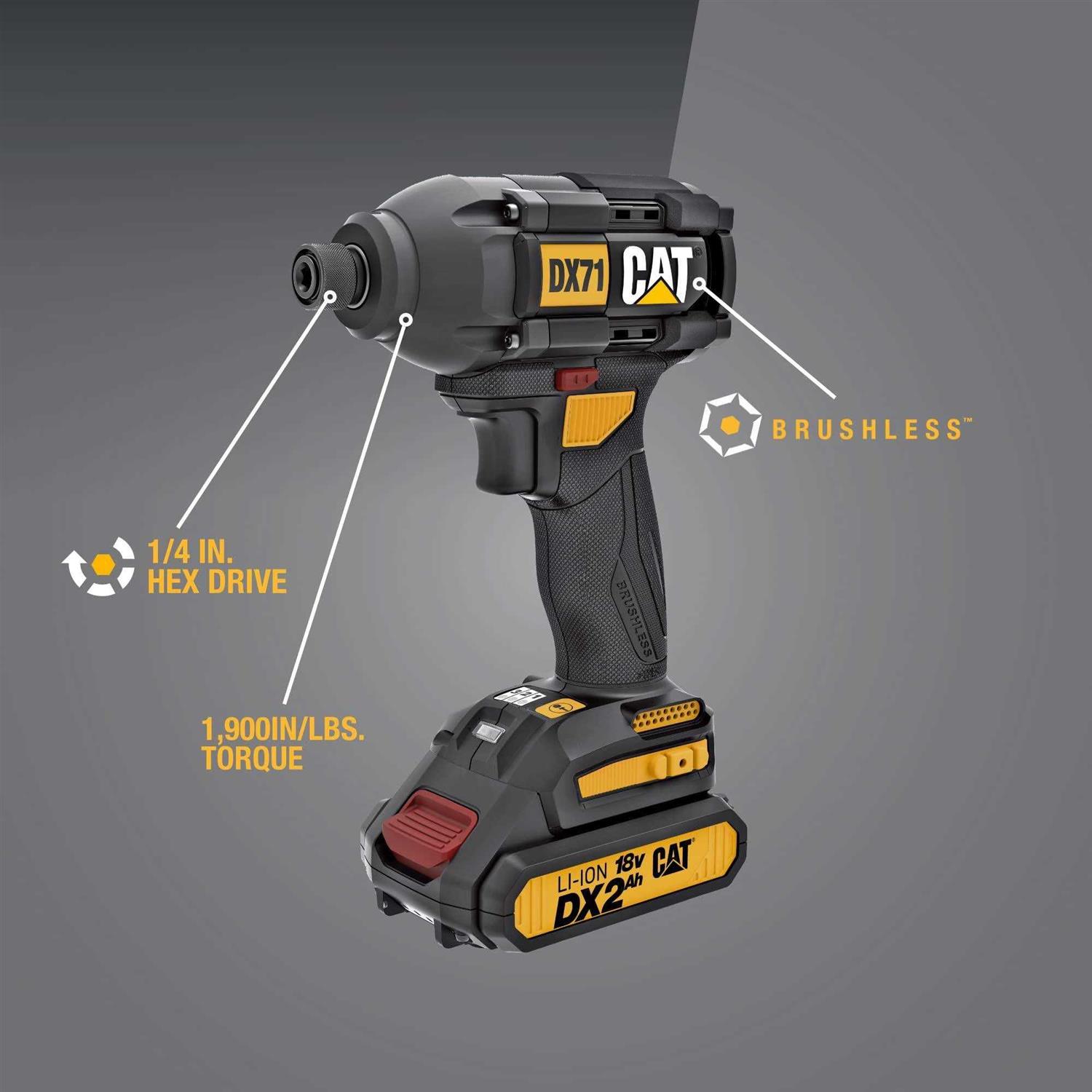Cordless Impact Driver with Brushless Motor uses advanced technology and design to enhance power and performance for pro-grade driving projects. Built with a High-Efficiency Brushless Motor, this cordless impact driver delivers 25% more power, 50% longer run time, and 10X longer life than brushed-motor drivers. Supported by a durable 3-Speed All-Metal Gear Case, this equipment can take on both standard and heavy-duty driving applications: use the low-speed setting that reaches up to 600 RPM, the mid-speed setting for up to 2,100 RPM, or the high-speed setting that achieves up to 2,000 RPM. And with variable speed functionality, its easy to maintain precise control over RPMs for specific applications. This impact driver packs a max impact rate of 3,600 BPM and max torque of 1,900 in/lbs. to drive into concrete, tile, stone, brick, and other masonry materials with ease. Rely on the hex drive to reliably grip and quickly switch out various bit sizes. To support extended work, the cordless drill weighs only 3.7 lbs. and features a Textured Overmold Grip that reduces fatigue and improves control. Includes stackable, easy-transport Slide Lock case with innovative locking and durable construction to defend against dust, water, and impact damage. The 1 For ALL battery platform is a rechargeable, interchangeable system that supports all tools within the expansive 18V cordless power tool line from Cat. For optimal performance, run time, and protection, choose the 5.0Ah Graphene battery over lithium-ion options.