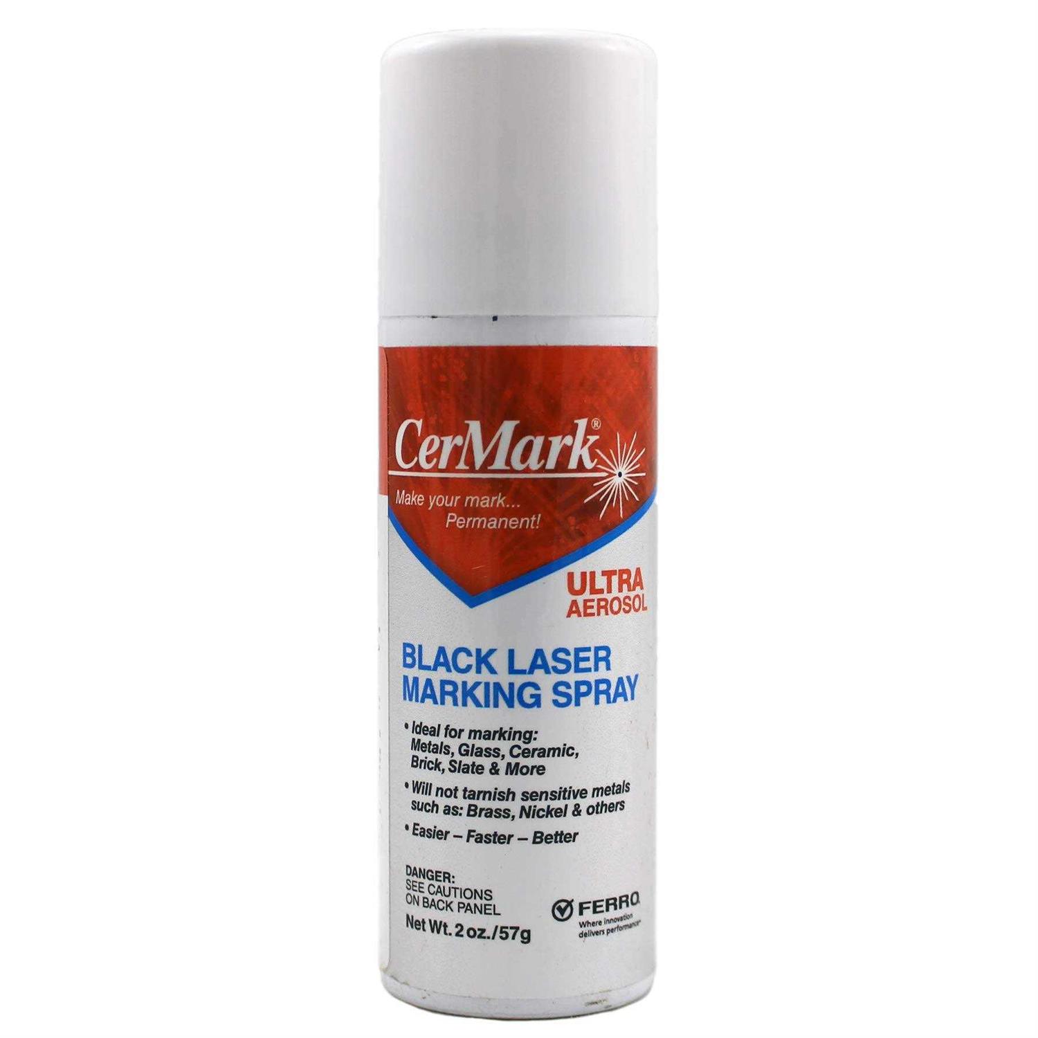 Improve your lasered work with Cermark Ultra. Formulated to work on metal, ceramics, glass, stone, brick, slate, and more (not intended for painted items, wood, or plastic). Cermark Ultra improves the laser bonding in every way and will improve the lasering quality on almost any surface. The coating will create deep black marks at a range of power and speed settings, including very fast settings from a CO2 laser. Cermark Ultra will not tarnish or stain sensitive metals such as brass, copper, and some other forms of steel. The spay can allows for easy mixing prior to use, just shake thoroughly. Easier – Faster – Better CerMark ULTRA black laser marking aerosol utilizes a patented laser bonding technology that offers a unique non-damaging solution that delivers permanent, high-resolution marks on metal using a spray application process. BR BR ALL-IN-ONE HIGH PERFORMANCE LASER MARKING AEROSOL FOR METAL /B BR CerMark ULTRA laser marking aerosol offers an improved formulation that creates exceptionally high-quality marks for almost every metal substrate. BR THE CERMARK ULTRA ADVANTAGE /B BR Specifically formulated to not stain or tarnish sensitive metals such as brass, copper, sterling silver, steel and others like other laser marking products can BR Marks created with CerMark ULTRA black laser marking aerosol are resistant to common strong acids, bases, organic solvents and extreme heat or cold. BR ULTRA marks also exhibit good salt spray resistance, scratch resistance and weathering resistance based on QUV testing. BR Once dry, ULTRA aerosol will not rub off on fingers while handling. This will allow immediate coating of parts with the ability to laser mark later when needed. BR Note: The logo on the bottom of the can may read either Ferro or “Vibrantz Technoligies”, both styles of cermark cans are the same.
