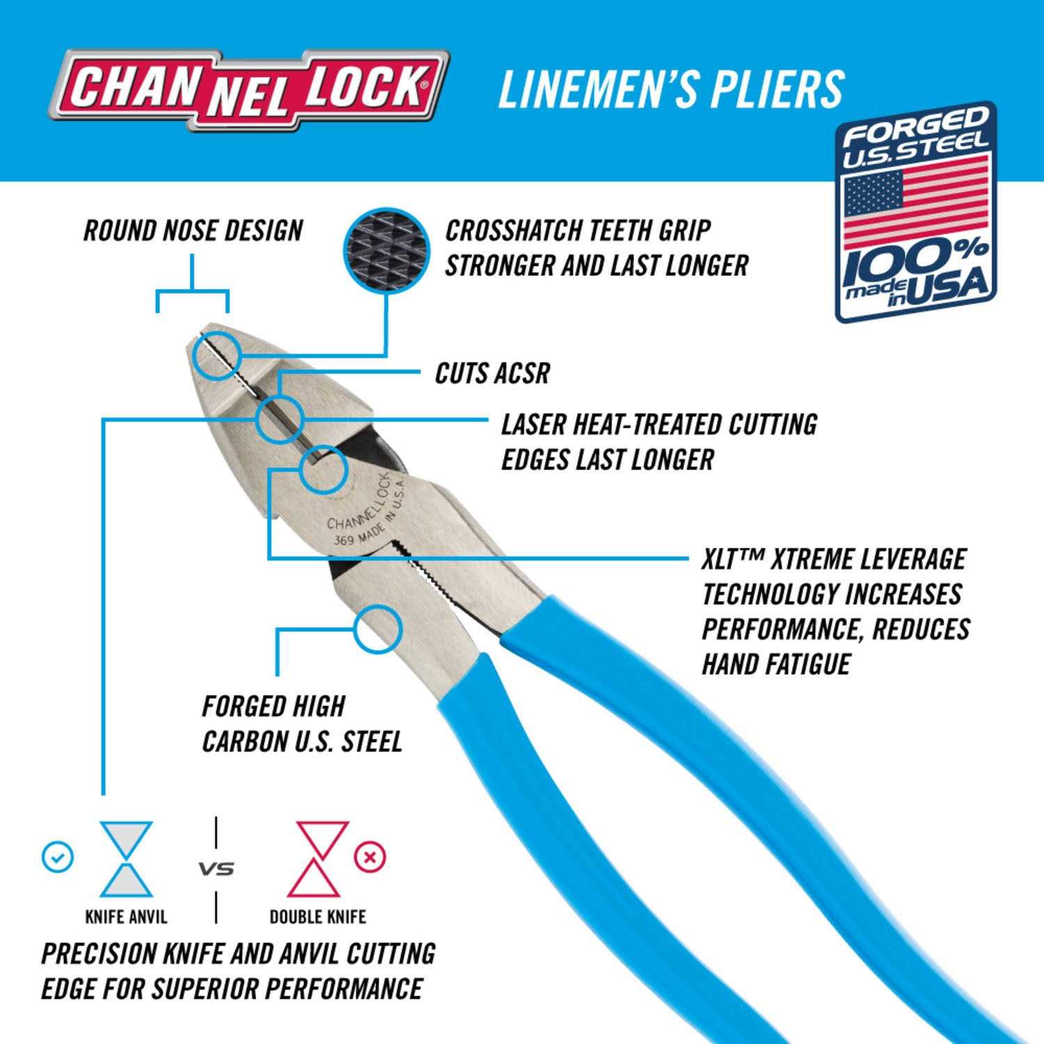 The High Leverage, part of Channellocks Linemen’s range, is a premium quality plier. Referred to in the USA as Linemen plier and combination plier in the UK, it is useful tool for for electricians and trademen for gripping, bending, twisting and cutting wire. Manufactured from high C1080 high carbon steel and with an electronic coating for rust prevention, these pliers are the ultimate in durability. The cutting edge of a Channellock plier is knife and anvil in style, giving the perfect mating and longest life of the cutting edge. The tool also features a useful crushing area. Channellocks signature Channellock Blue comfort grips, finish it all off.