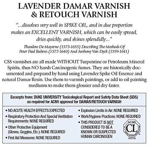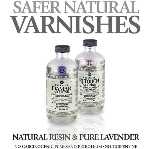 Chelsea Classical Studio brings you a line of safer, natural varnishes for your fine oil paintings. No harsh chemicals are used in their production — no petroleum, no turpentine, and no dangerous fumes. Made with CCS Lavender Spike Oil Essence, these varnishes feature a distinctive lavender scent. They’re prepared by hand using premium natural materials and formulas based on historic recipes and techniques. Handcrafted from the finest materials, Lavender Damar Varnish can be used as a final, protective varnish or with mediums to thin paint and decrease drying time. This varnish is made with Lavender Spike Oil Essence, which is a historically documented solvent used since the Renaissance. It is non-carcinogenic and has a strong herbaceous scent. Use in a well-ventilated area, and it may not be suitable for people who are sensitive to strong scents. Our Painting Varnishes come in glass bottles.