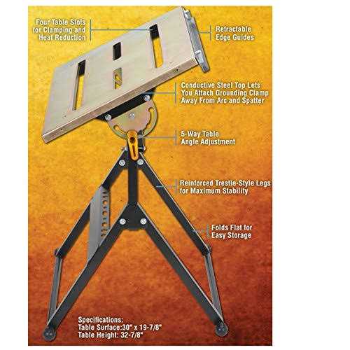 The steel surface of this adjustable welding table gives you a steady, flameproof surface for welding parts and components. Designed for conductivity, connect your welding clamp directly to the welding table safely out of the when you work on smaller pieces. Adjustable angle and fence give you a variety of welding options. Maximum Working load (lbs.) 350 lb. Product Height 32-7/8 in. Product Length 30 in. Product Weight 36.1 lb. Product Width 19-7/8 in.