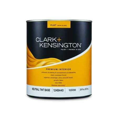 C+K INT PP1 FLT NEUT QT *Sub Brand: Clark+Kensington *Sheen: Flat *Base Type: Neutral Base *Coating Material: Acrylic Latex *Product Type: Paint and Primer *Indoor or Outdoor: Indoor *Container Size: 1 qt. *Mildew Resistant: No *Coverage Area: 400-450 sq. ft. *Recommended Surface: New or previously painted wallboard, masonry, and wood; and for primed or previously painted plaster, or metal. *VOC Level: 48 g/L *Water Resistant: No *Tintable: Yes *Clean Up: Water and Soap