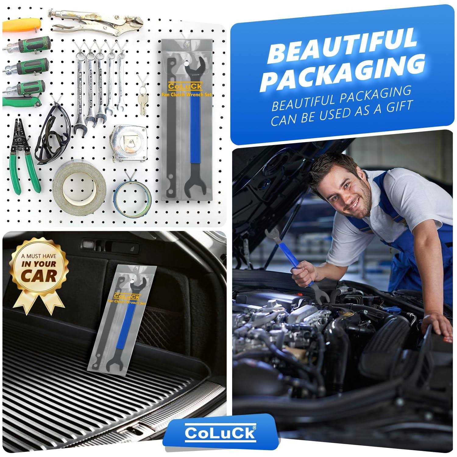 FITS YOUR VEHICLE- Fan Clutch Wrench Set is NOT FIT for Chevy models chevy astro van & 2003 Ford F150 5.4 engine 2000 7.3 powerstroke f250 2003 Ford F150 5.4 2005 Ram 2500 2008 1999 f150 2007 F-150 5.4L , but not limited to. Fan clutch wrench tool compatible with BMW models such as E46, E36, E30, E39, E46, E54, E1997, 328i,330i, 533i,530i, 540i, 325i, M4, M10, M20, M30, M40, M44, M50, M52, M52TU, M54, M56, M60, M70, M73, S14, S38, S54, S50B30, S50B32, and 1997 Z3 1.9. REMOVE & REPLACE AUTOMOTIVE FAN CLUTCHES- Elevate your toolkit with the CoLuck Fan Clutch Wrench Kit, featuring 32mm and 36mm fan clutch wrenches along with a Fan Pulley Holding Tool. This set is engineered for effortless removal of lock nuts on temperature-dependent viscous fans, making it the ideal fan clutch removal tool kit for your engines. The holder bar securely locks the water pump pulley in place, ensuring a precise fit and substantial cost savings. ENGINEERED FOR DURABILITY- Our 15-inch fan clutch removal tool wrench and holder are specially lengthened to provide extra leverage and a sure grip when working on hard-to-reach fan clutch nuts on engine fans. The rubber-covered handle in the middle helps reduce hand fatigue during prolonged use, offering durability and comfort. USER-FRIENDLY DESIGN- Attach the pulley holder bar with your bolts inserted through the holes, lock it securely in place on the water pump face, place the fan clutch wrench on the fan clutch nut, and turn clockwise using the 32mm or 36mm spanner (both included) to loosen the nut. If the tool’s hole sizes are smaller than the bolts holding the pulley wheel to the water pump, remove the bolts and effortlessly reinstall them over the bar. ESSENTIAL FOR MECHANICS- Say goodbye to time-consuming and frustrating clutch fan removals. The CoLuck Fan Clutch Removal Tool Set, equipped with a 32mm & 36mm fan clutch wrench and water pump pulley holding tool, streamlines water pump and fan clutch replacements. Make this indispensable set your trusted assistant- just add it to your cart now!