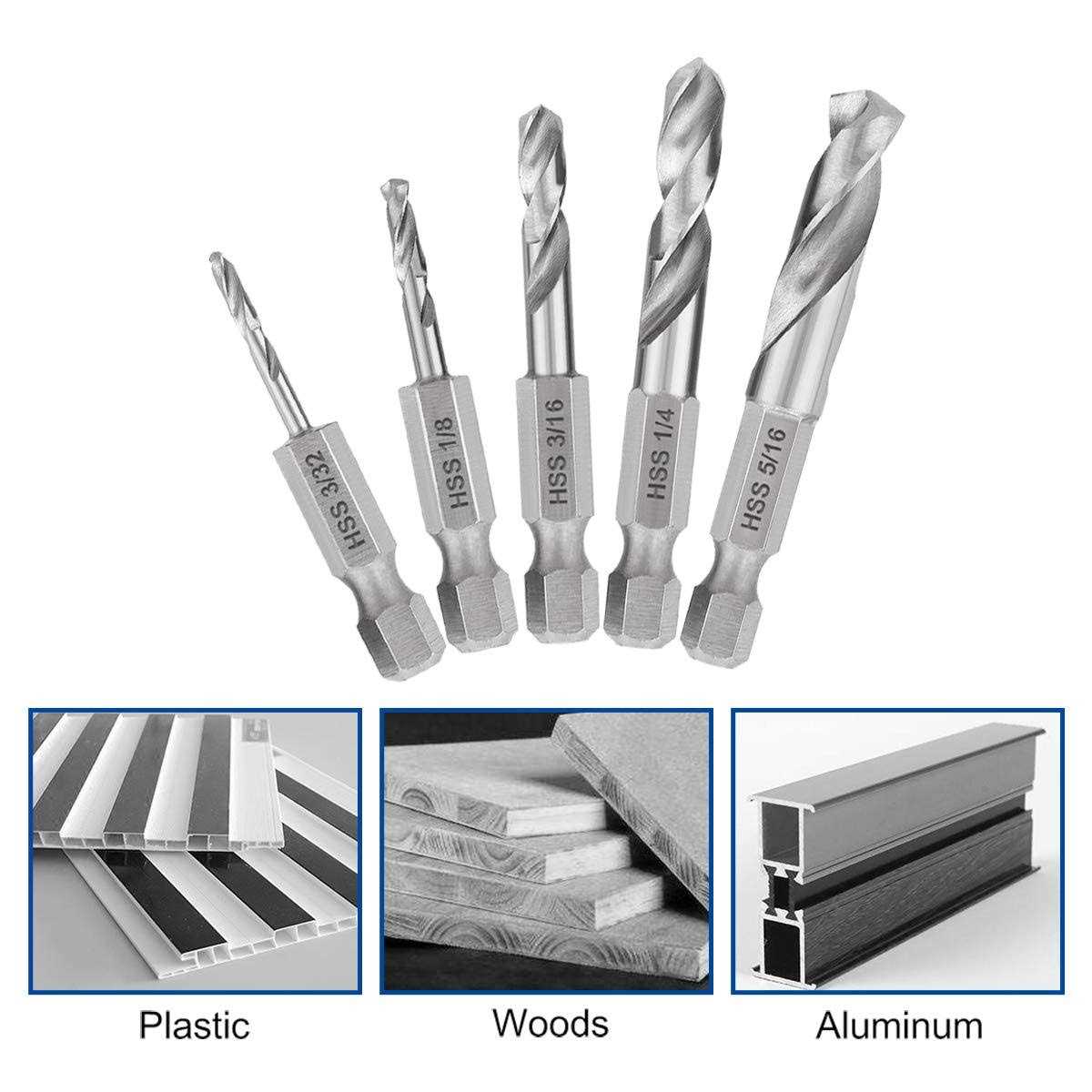 Premium High Quality – Short length drill bit is made from superior HSS M2 material with evenly distributed carbides for long lasting strength and durability. The drill bit is always sharp at each use. Twist Design – Full ground processing and 135 degrees split point clears chips & particles faster, it also delivers powerful penetration against the metal , plastic, wood and other hard surfaces. Quick Change – 1/4” hex shank fits into all power tools more easily and securely, it is suitable for quick change drill chunks for fast and easy swapping. Application Widely – The drill bit set includes 5pcs of drill bits in 5 different sizes to satisfy your demands: 3/32”, 1/8”, 3/16”, 1/4”, 5/16”. The drill bit set is more suitable for processing plastics and woods, it can be also used for hard metal. 【Quality Material】 The short drill bit is constructed of M2-speed steel for fast cutting tough wood material 【Quarter Inch Shank】 Drill bits are equipped with a 1/4” hex shank making it easy to use on quick-change drill chucks for fast and easy swapping 【Less Breakable】 Short length helps reduce the change of reflection or breakage when drilling. 【No Skating】 No skate tip helps reduce bit walking and eliminate the need for a center punch for clean and accurate starts 【Easy and Simple Organization】 The set comes with a bit holder that is labeled with each bit size for quick identification. Slim profile allows set to be stored in small toolboxes