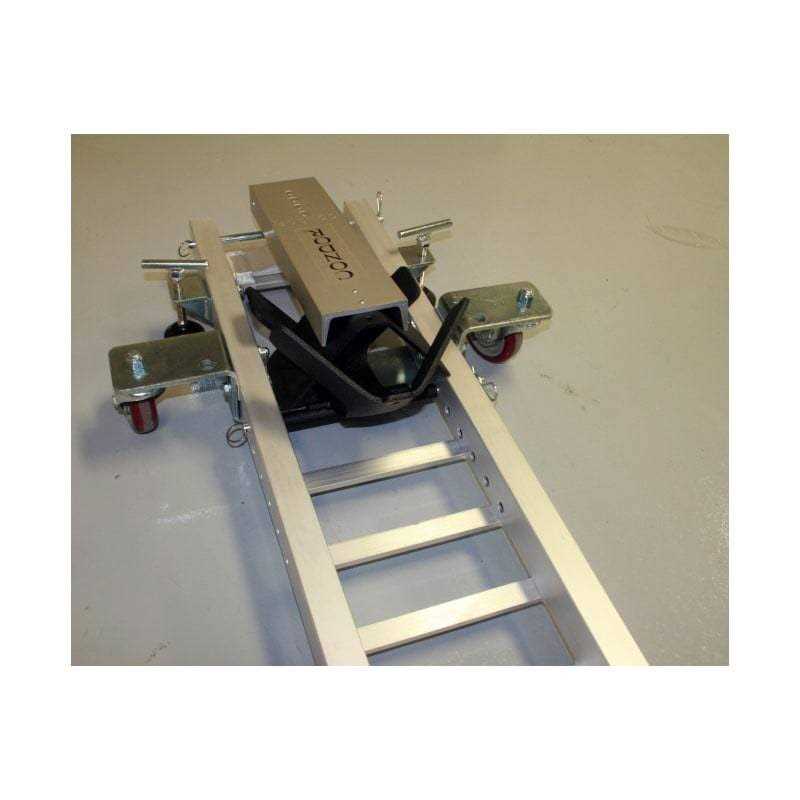 The Garage Dolly rides on sturdy 4-inch wheels, so it will roll or swivel easily, and will even navigate cracks, crevices, and pitted garage floors. The Dolly is made from sturdy aluminum and steel and only weighs 68 lb. When not in use, it folds and can be mounted on a garage wall for storage. The Garage Dolly has a load rating of 1300 lbs. It measures 90′′ long (expandable to 94′′) and has a deck dimension of 12′′ wide. It is 24′′ at its widest point at the wheel brackets. Four large twist-down brakes, (along with having the wheels down as well) secure the unit from rolling when placing your bike into the Dolly, or removing it.