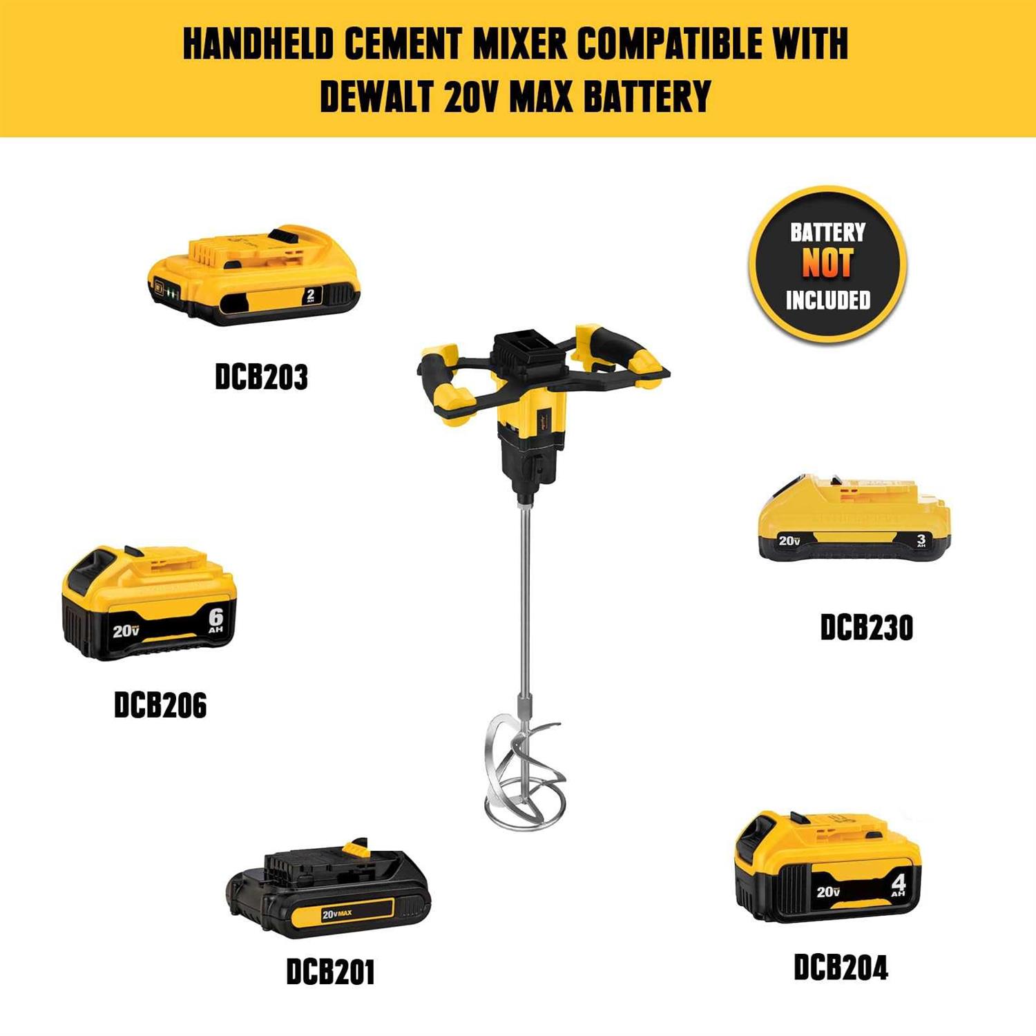 The power cement mixer is designed for Dewalt 20V Max batteries (Battery NOT Included). It has a 2-speed option (0-420RPM and 0-710RPM) for versatile mixing. Safety is ensured with overheat protection, and it features an ergonomic dual-handle design. The Handheld mud mixer works with various materials, such as cement, mud, paint, plaster, and putty.