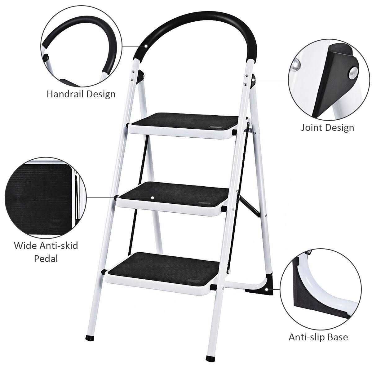 - This is foldable three steps ladder which is ideal for any task around the kitchen office bathroom and garage.