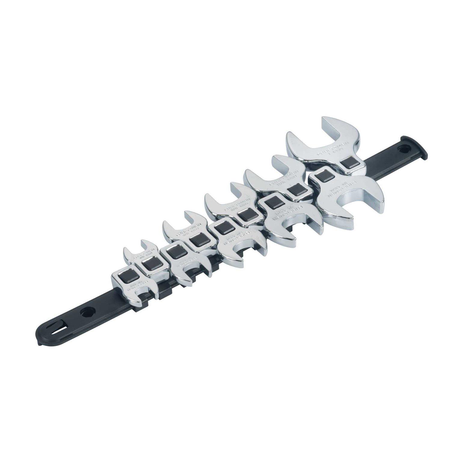 CORROSION RESISTANT Full Polish Chrome Finish for Corrosion Resistance. ACCESSIBILITY Attaches to any 3/8-in drive bar or ratchet for accessibility in tight spaces. EASY IDENTIFICATION Large Markings for Quick Wrench Identification. Meets or Exceeds ASME Specifications. Common applications include automotive mechanical and home repair. Includes 10 3/8-in Drive Crowfoot Wrenches SAE 3/8-in 7/16-in 1/2-in 9/16-in 5/8-in 11/16-in 3/4-in 13/16-in 17/18-in 1-in.