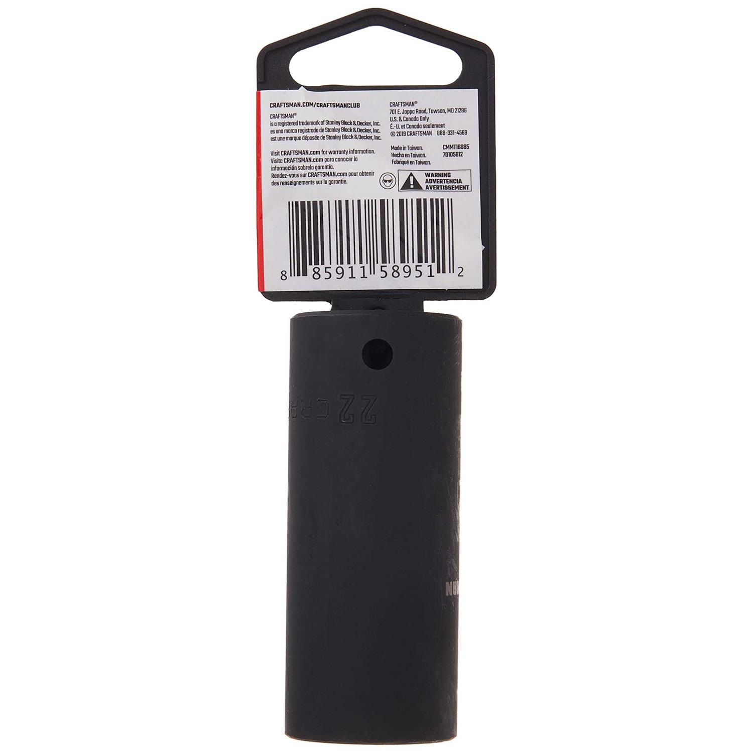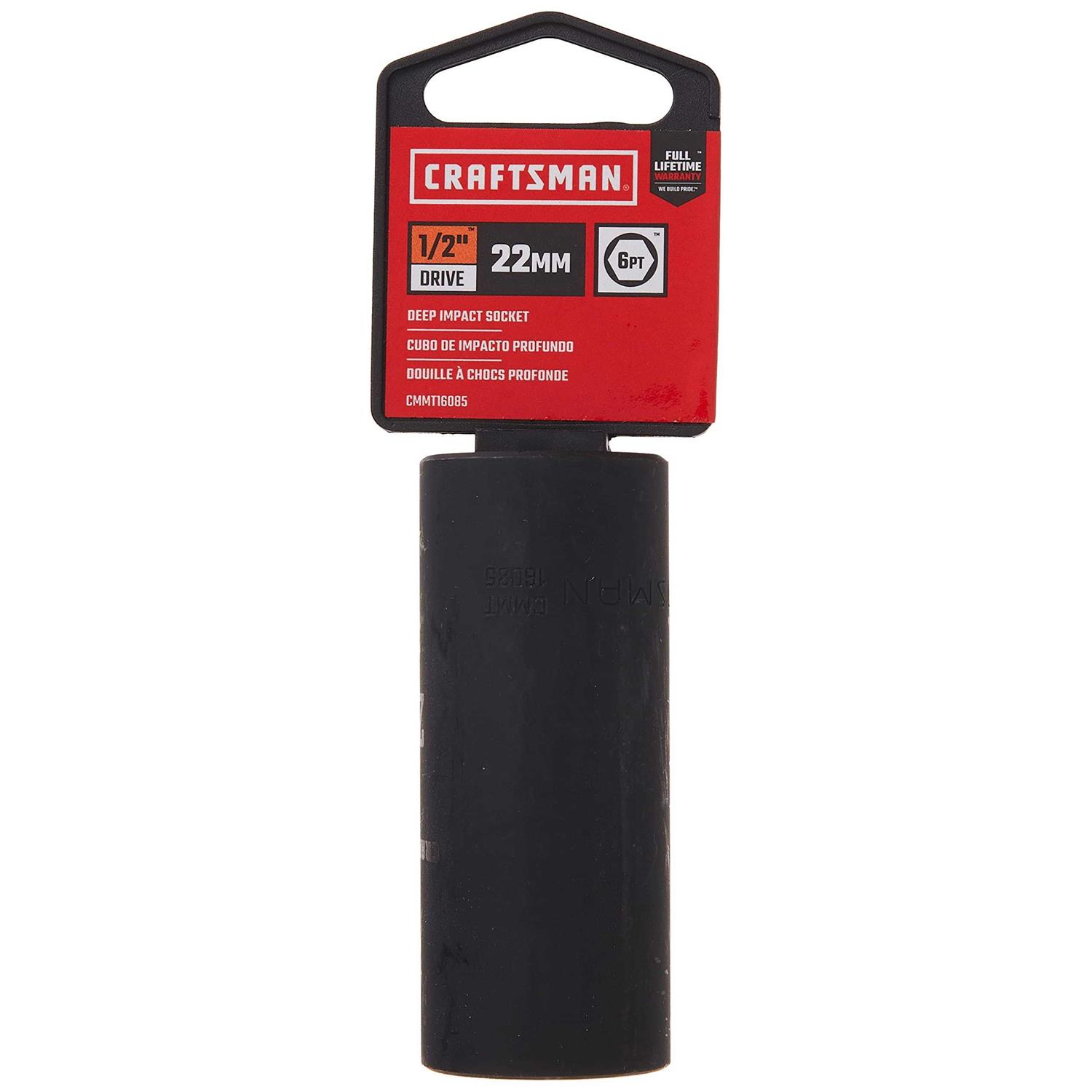 Craftsman 22 mm x 1/2 in. drive Metric 6 Point Deep Impact Socket Sold ASCase of 3 Product Overview Impact tools get the job done faster with less effort. Easy-To-Read laser etched size markings makes it easy to locate the right socket for the job. Great for working in low-lit or greasy environments. Permanent marking resists chipping, fading and corroding. 1/2 in. size drive22 mm Metric 6 point impact socket Impact tools get the job done faster with less effort Laser etched size markings makes it easy to locate the right socket for the job Great for working in low-lit or greasy environments Permanent marking resists chipping, fading and corroding Black oxide finish and Made of alloy steel Easy to read Impact sockets are for use with impact drivers Socket wall dimensions are optimized to provide strength while providing access to restricted fasteners.