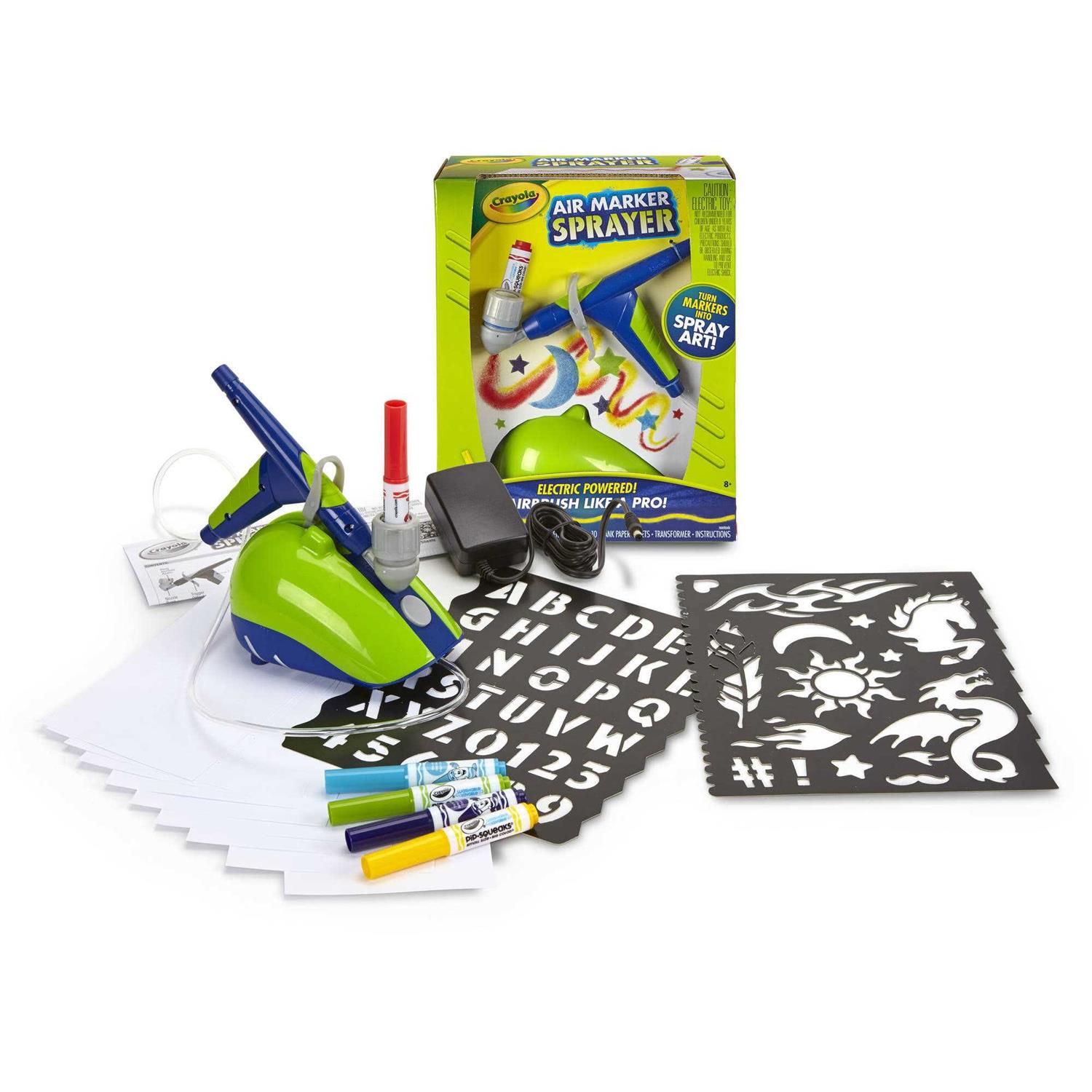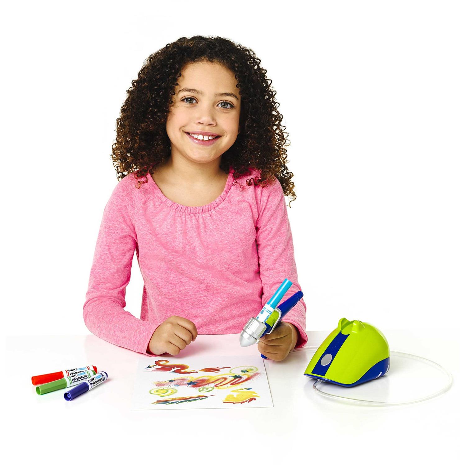 The Crayola Air Marker Sprayer turns ordinary markers into spray art just like a real artist’s airbrush to create art on paper, t-shirts, windows and more. Your little one will be inspired to explore for hours. The sprayer works with many different Crayola broad line markers, including fabric and window markers and it’s motorized, so just plug it in for continuous fun. This Crayola airbrush includes five pip-squeaks washable markers, two stencil sheets and 10 sheets of paper for hours of entertainment. The dual action trigger allows kids to press or pull and the easy twist n’ load nozzle gives markers the optimal position to spray with smooth consistency. This Crayola Air Marker Sprayer provides a fun way for kids to experiment with spray art and it fits snugly in their hand giving them complete control to create their masterpieces.