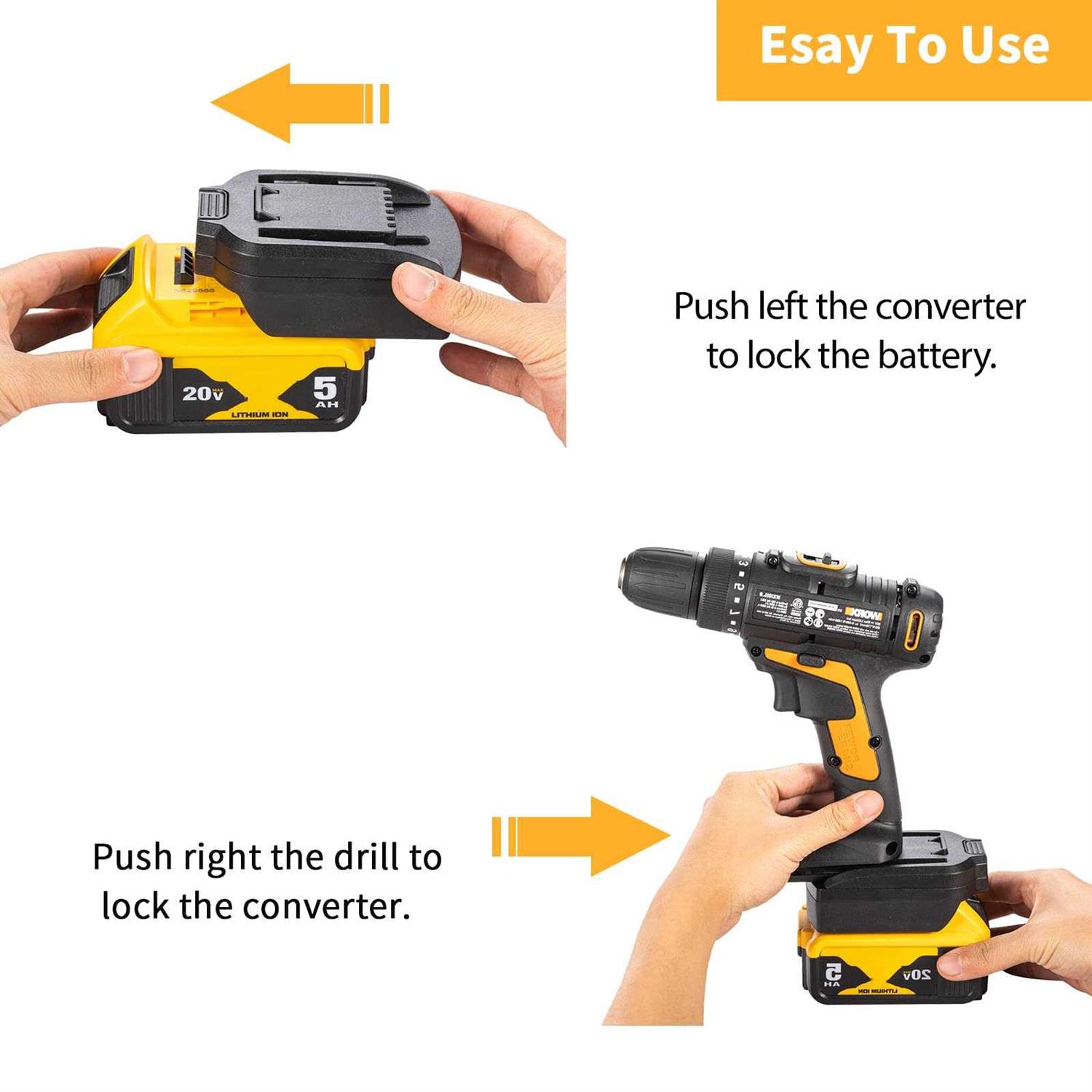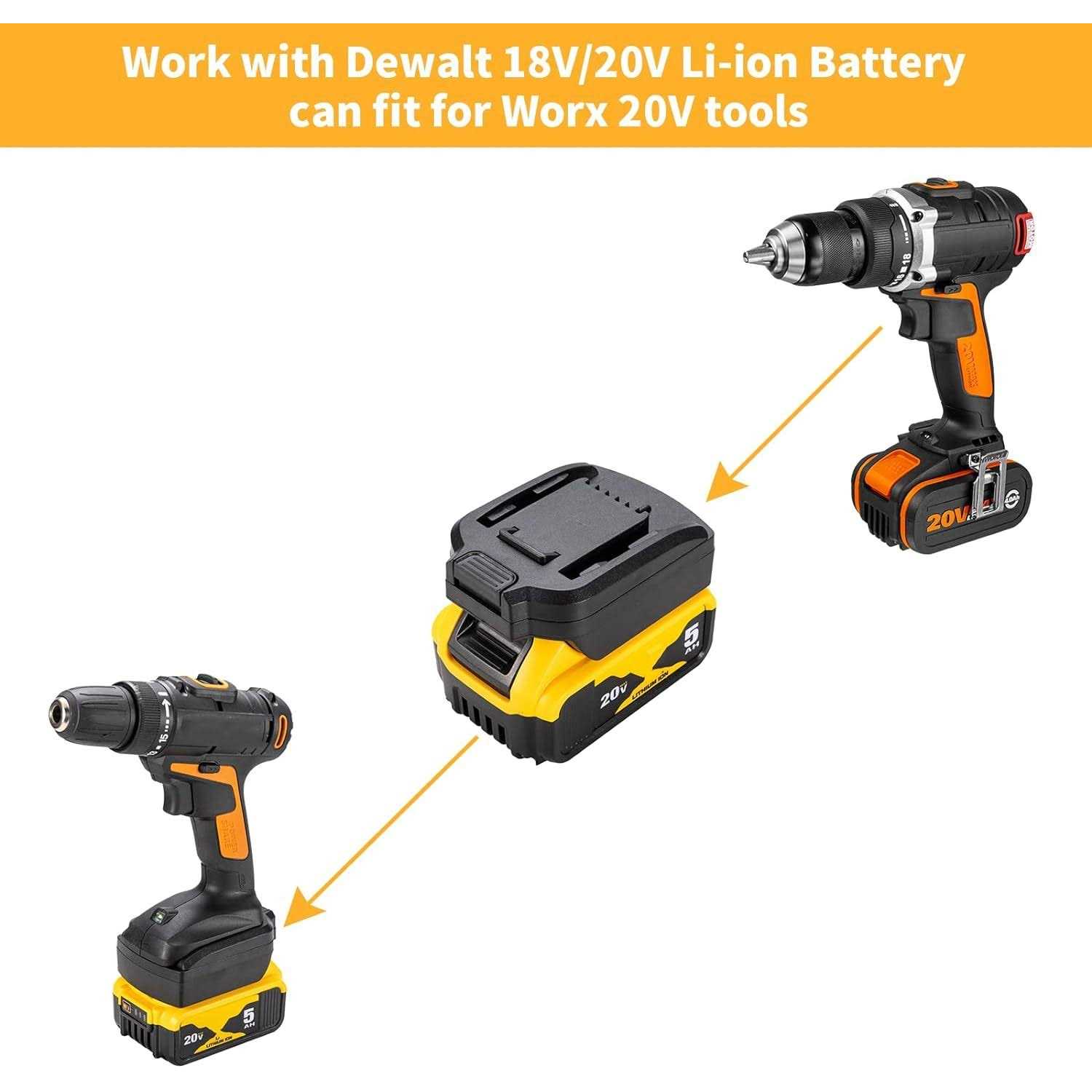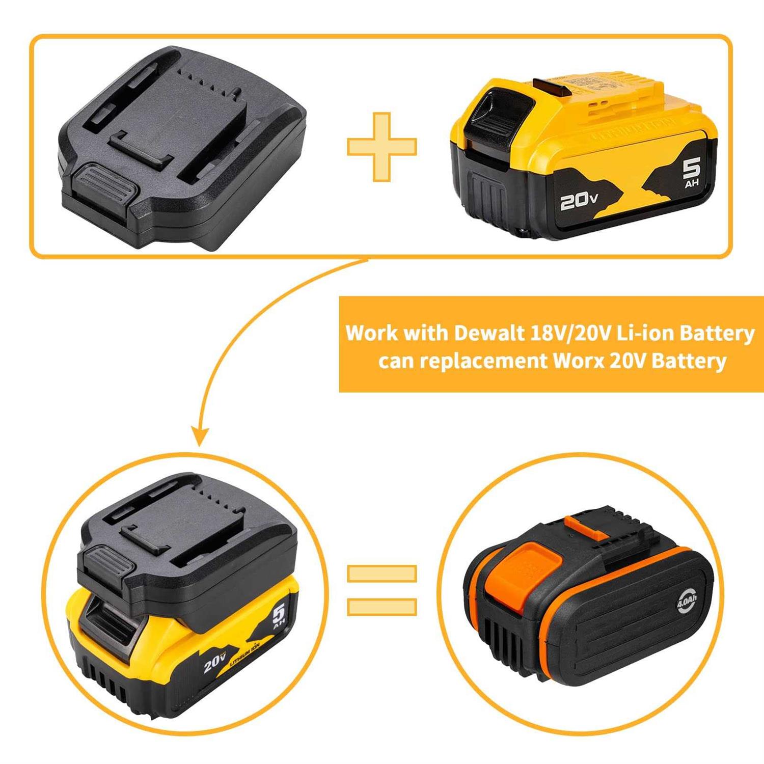 1、This adapter converter(battery not included) can not be charged . You must charge the battery with a suitable charger. 3、The bottom of the adapter work for DeWalt 20V battery, which can replace Worx 20V Battery. 4、Easy to install, please remove it from the battery when not in use.”